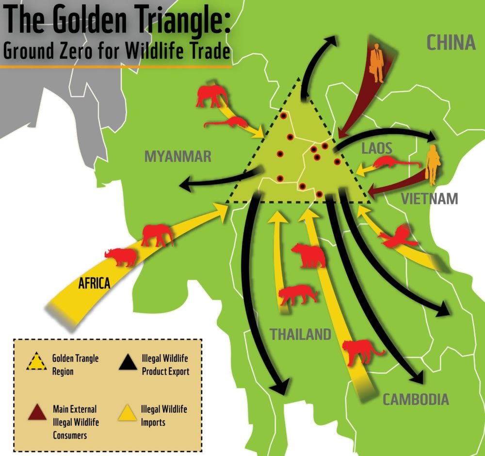Kunderne er især turister fra Kina og Vietnam. De rejser til Den Gyldne Trekant – grænseområdet, hvor Myanmar, Thailand og Laos støder op mod hinanden – for at købe bl.a. leopard-skind, elfenbenssmykker, ulovlige kæledyr og medicin med tigerknogler i. Området er verdens hotspot for heroin, opium, prostitution og altså også handel med truede dyr.