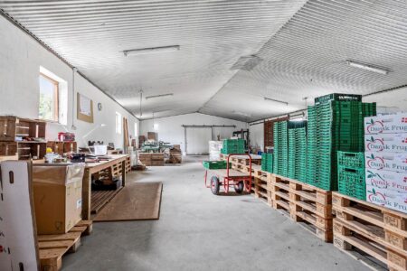 Gårdspladesen er indrammet af driftsbygninger i gule teglsten, som rummer gårdbutik, gildesal, lager og kølerum.