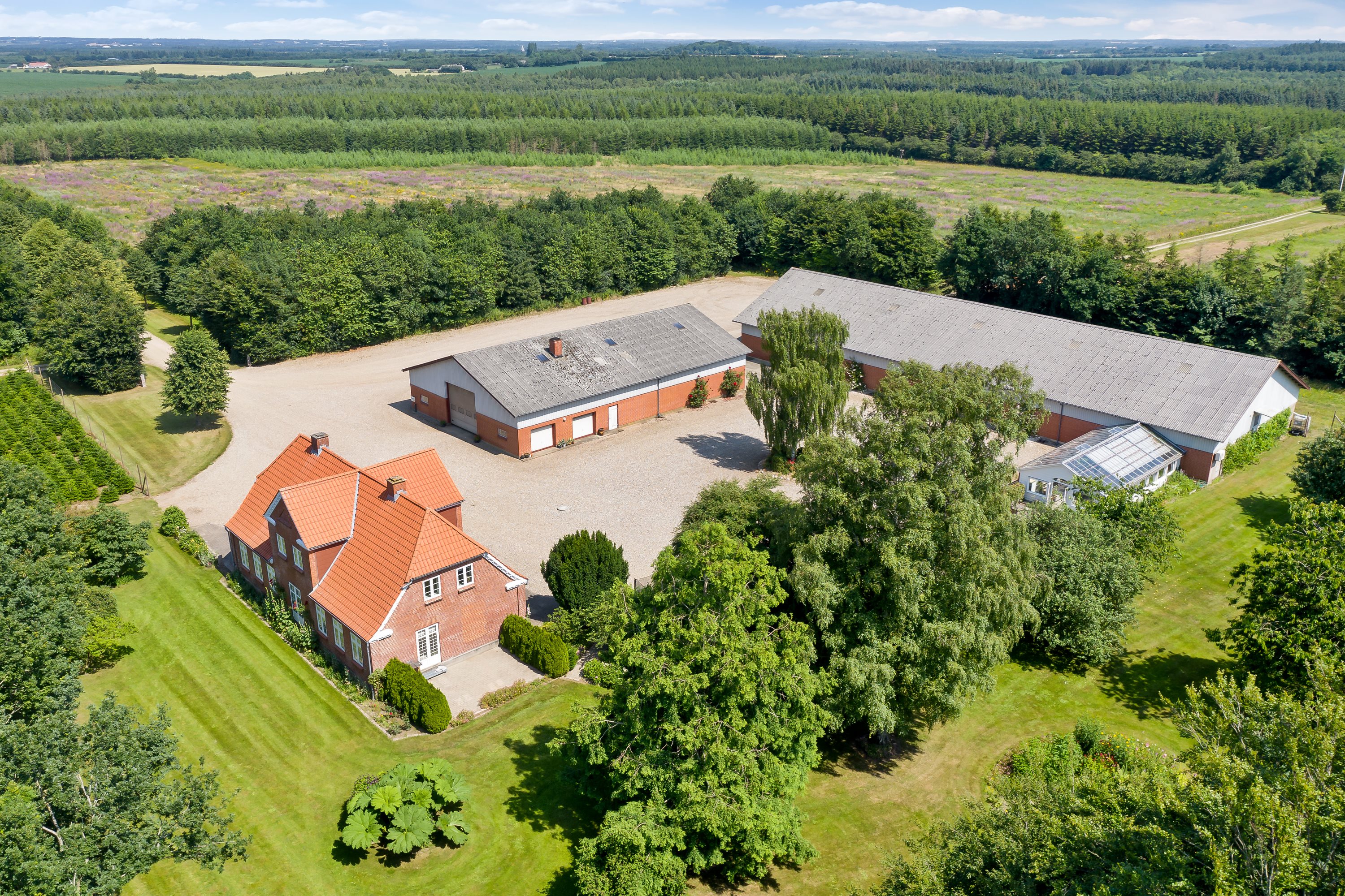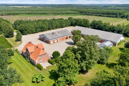 Præsentabel allé fører op til ejendommen, hvor et flot og harmonisk rødstensstuehus byder indenfor i en dejlig lys bolig, hvor man fra boligens hall har adgang til både vinkelstue samt ejendommens store lyse køkken med god skabsplads. Endvidere rummer stueplanen stor stue, stort bryggers med installation til vaskemaskine og tørretumbler. Fra bryggerset er der adgang til værelse med glasparti mod køkkenet, ligesom der i forbindelse med bryggerset er gæstetoilet.