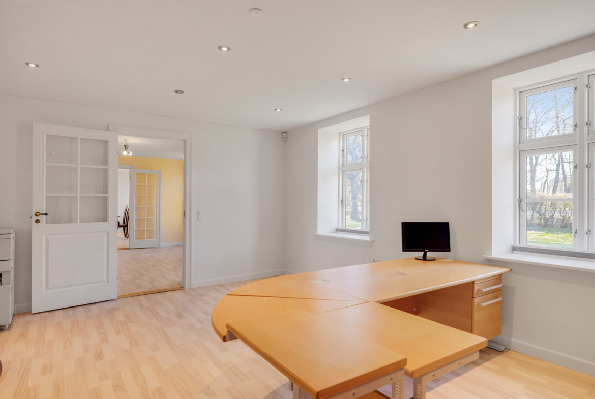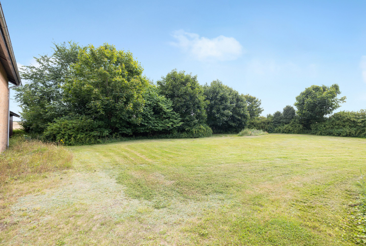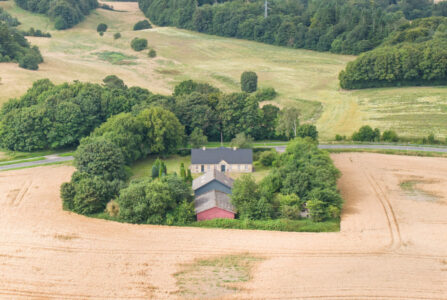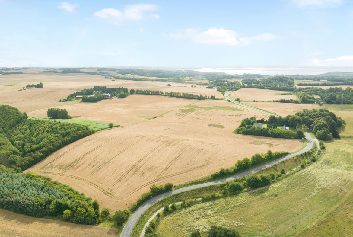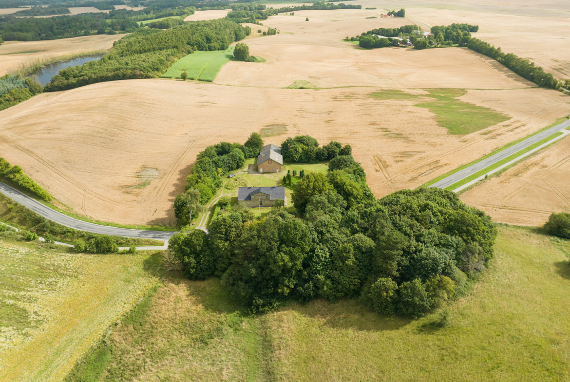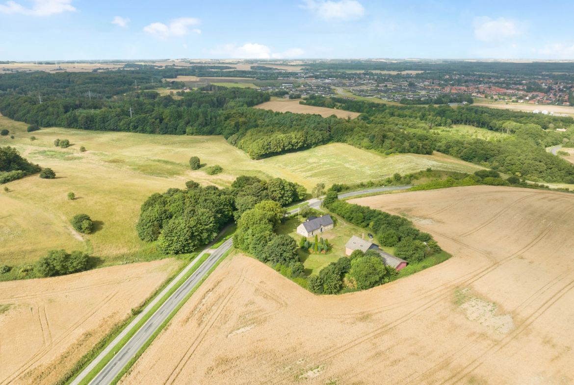 Rodskovvej 81, 8543 Hornslet byder på 49,5 ha samlet jord i et varieret og kuperet landskab. Ejendommen rummer både agerjord, græsarealer og egen skov med stier, vandløb og en sø – ideel til jagt og friluftsliv.