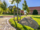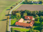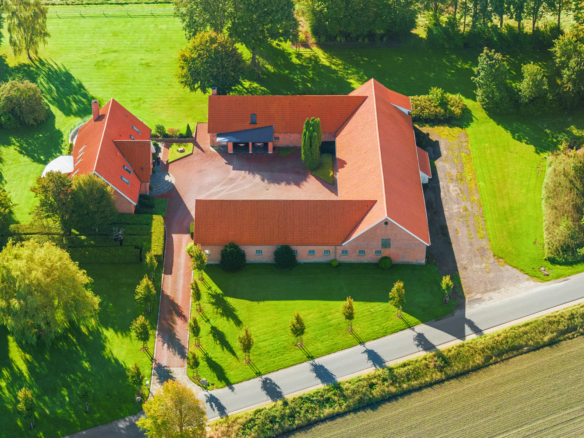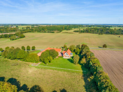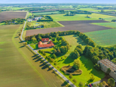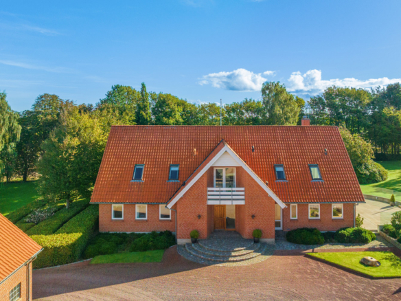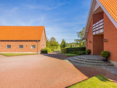 Ejendommen omfatter 2 ha jord samt 722 m² driftsbygninger, harmonisk sammenkoblet med hovedhuset i røde mursten og rødt tegltag. Smuk gårdsplads med røde perlesten og stor cirkelformet terrasse med glasværn og udsigt til have, gamle træer og ridebane – ideelt til hestehold eller liberalt erhverv.