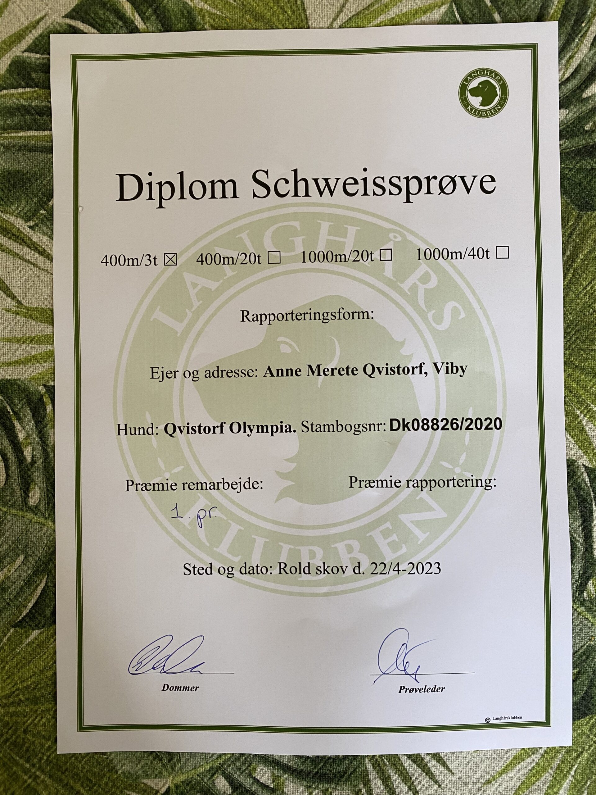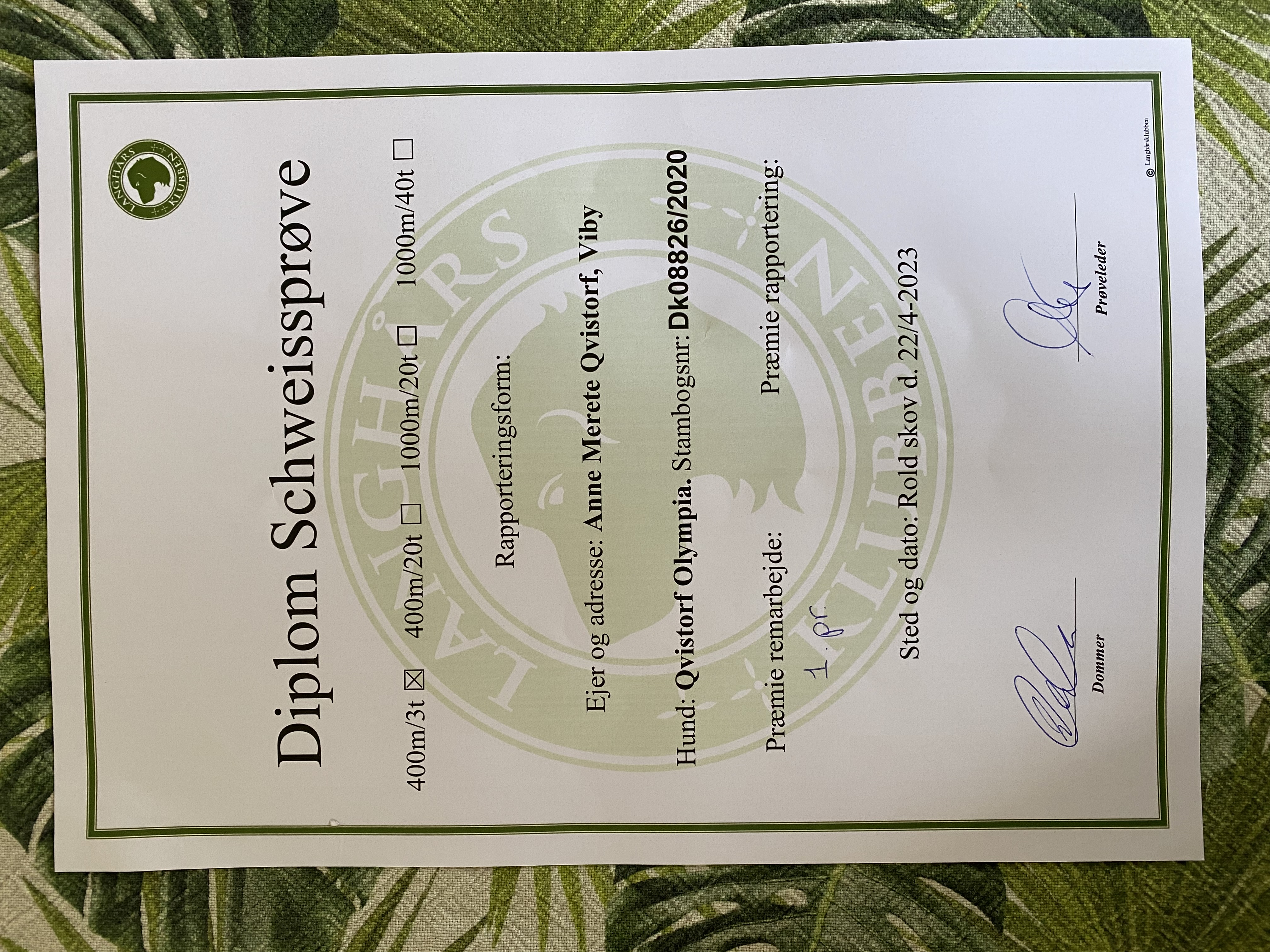 HD: A; Udstilling: Excellent, Prøver: 1. Præmie på 3 timers 400 m Sweiss, 2 x 1. Præmie markprøve åben klasse