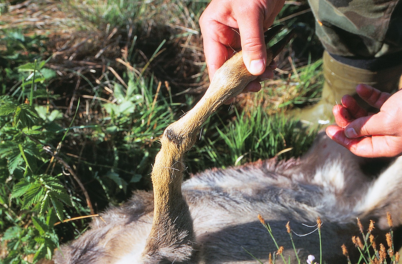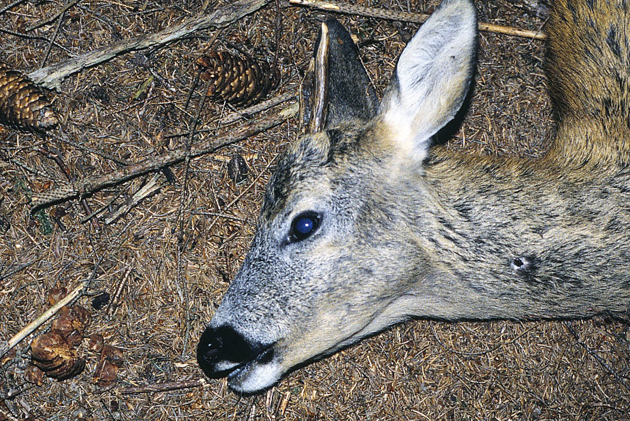 Nået ud på passende afstand fra hegnet blev bukken afskudt som en bestandspleje- og dyreværnsmæssig foranstaltning, og på grund af dens dårlige kondition blev bukken fundet uegnet til konsum og destrueret. Foto: Henning Kørvel