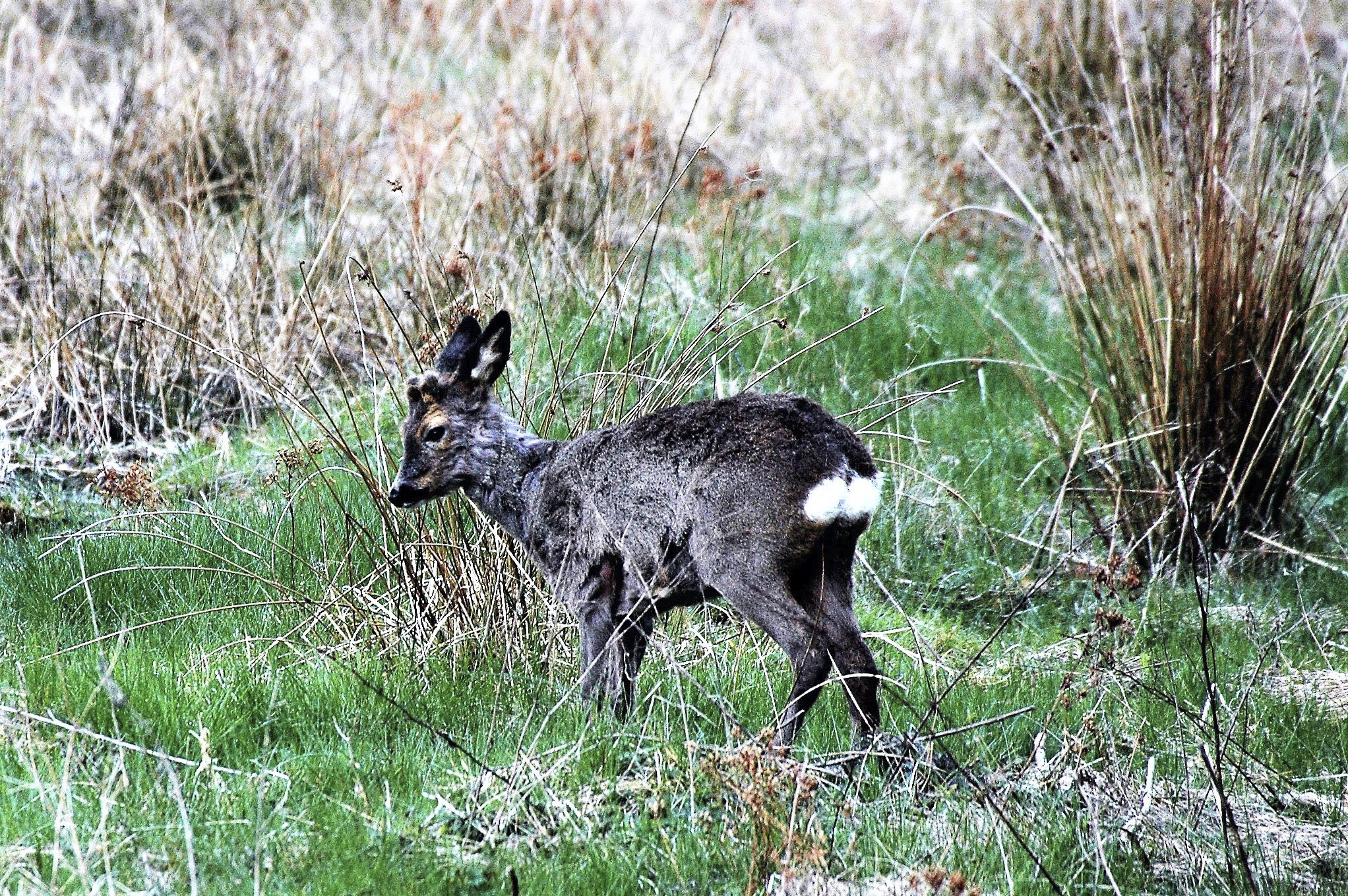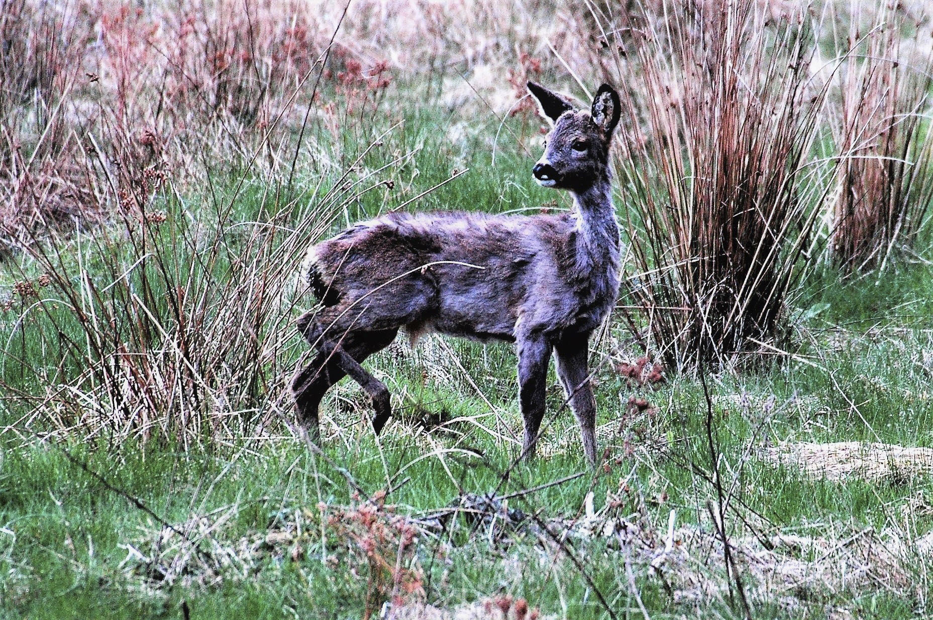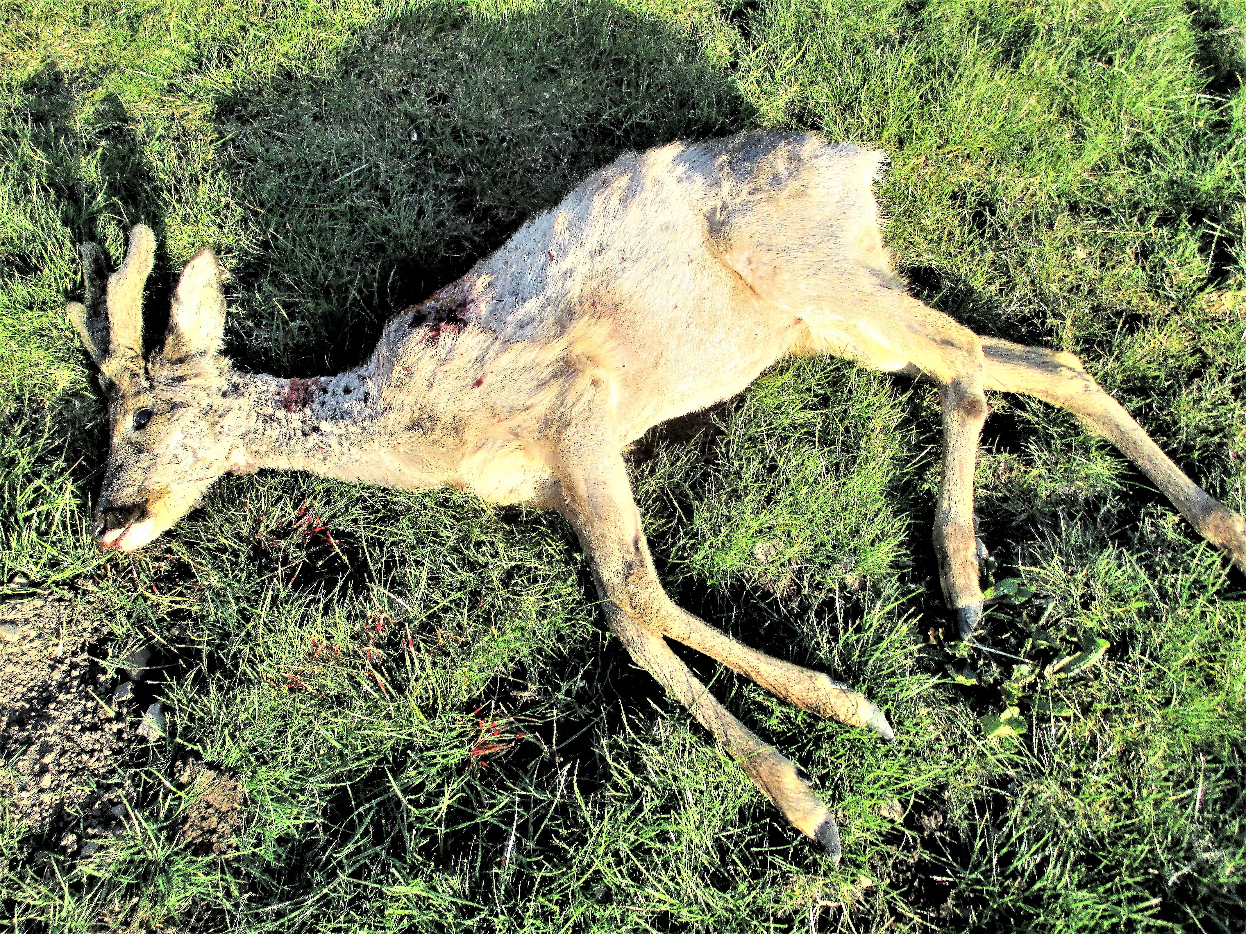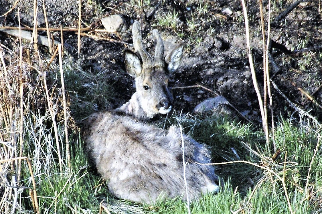 Pelsens dårlige forfatning og den synlige rygsøjle indikerer, at denne etårige buk på trods af normal opsatsudvikling for aldersklassen er i dårlig kondition. Bukken havde mistet skyheden og blev siddende på en skrænt cirka 40 meter fra bilen, fra hvilken fotoet er taget. Foto: Henning Kørvel