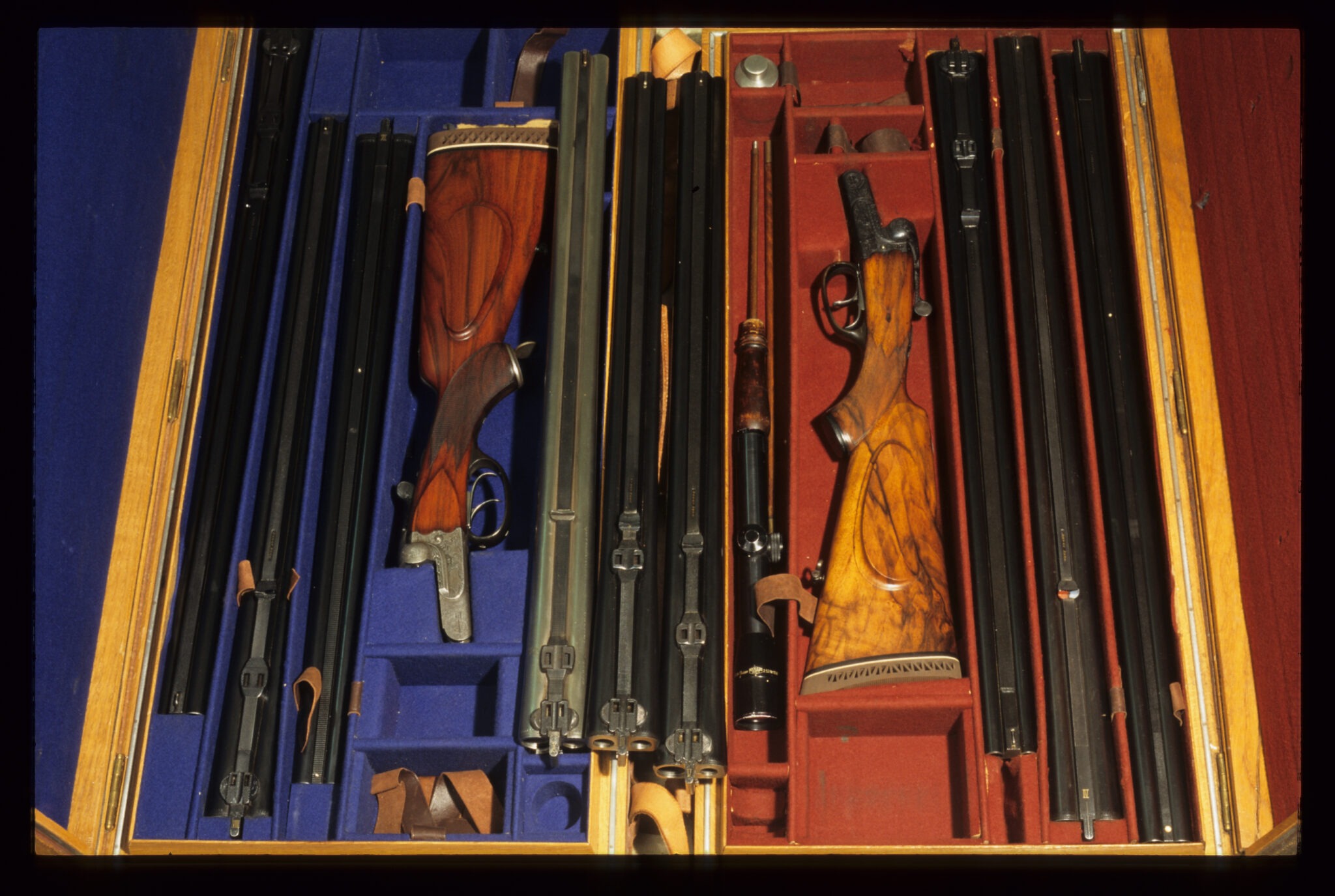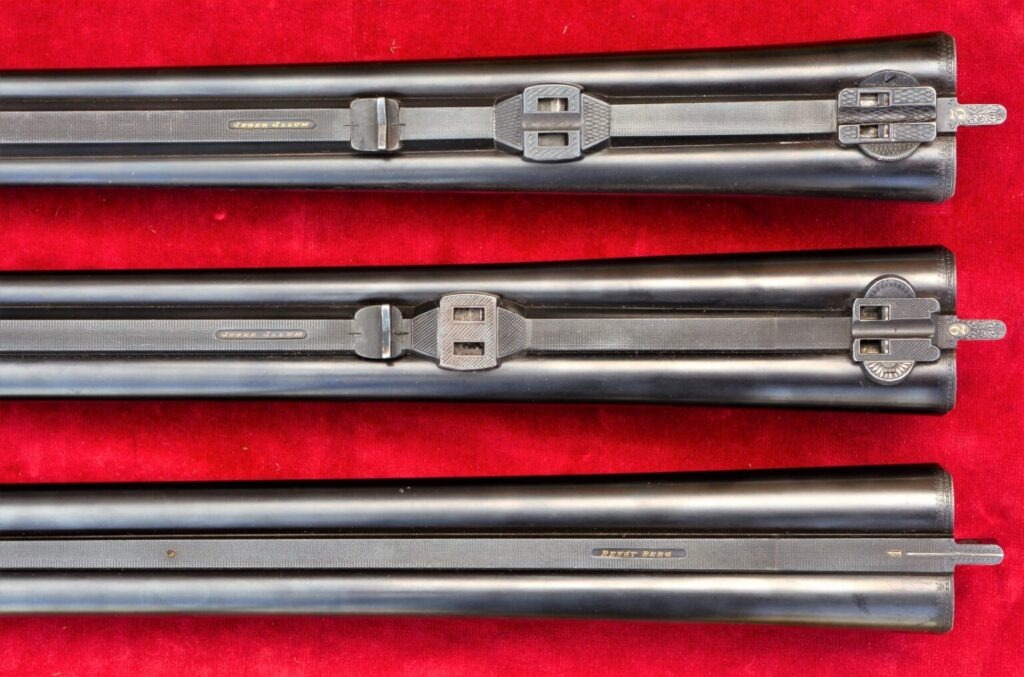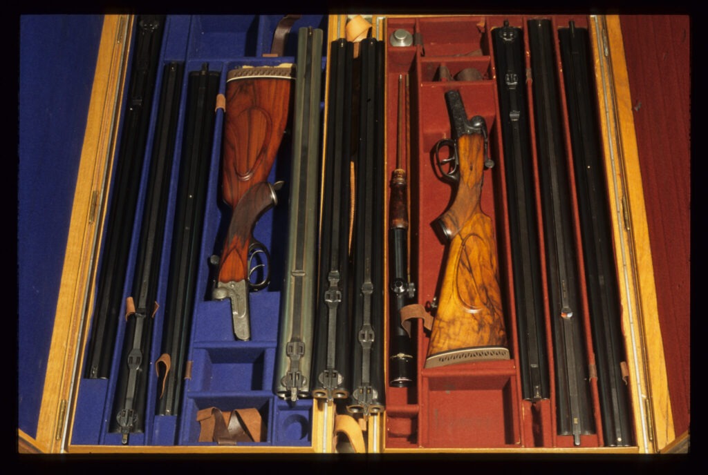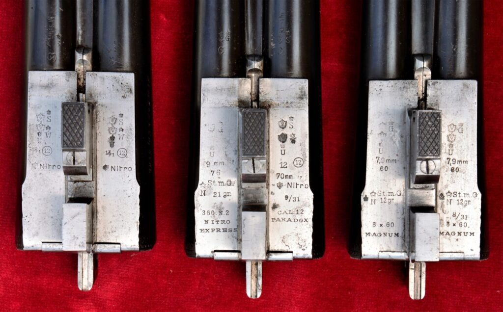 De to sæt kugle- og haglvåben fra Simson & Co. Det store sæt er med seks sæt løb, og det lille sæt med tre sæt løb, men begge har .470NF som det største kugleløb, og begge sæt inkluderer kaliber 12 Paradox.