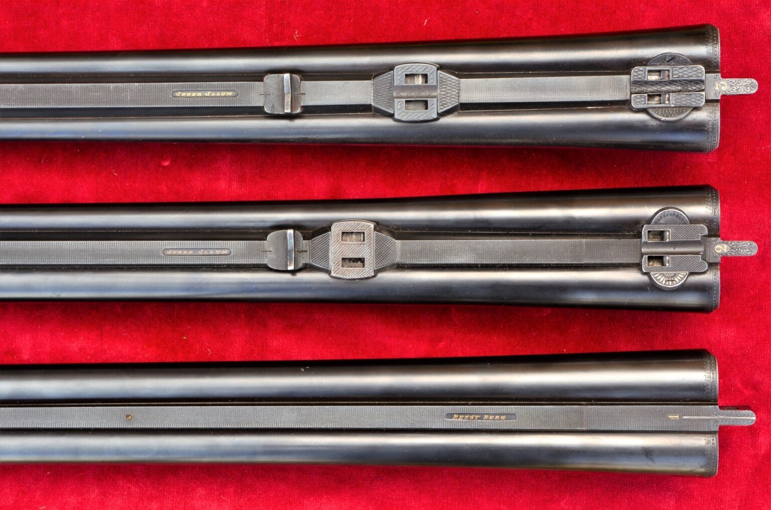 Intet blev overladt til tilfældighederne med så fine jagtvåben. På sigteskinnen står således navnene på de to respektive ejere: Bengt Berg og hans hustru, Inger Illum Berg.