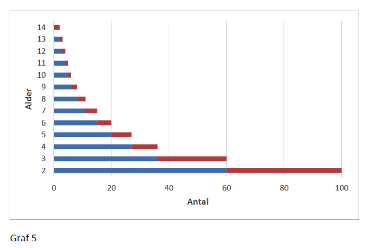 På X-aksen vises alderen og Y-aksen viser antal sprosser. De blå linjer er lagt ind af mig, og viser fra neden grænserne for 6-endere, 8-endere og 10-endere.