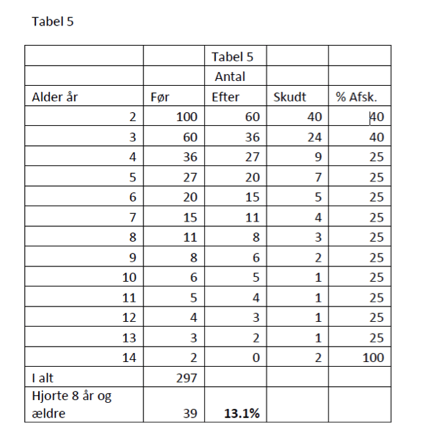 I Tabel 5 og Graf 5 er vist et eksempel herpå. Der er valgt en så kort jagttid, at afskydningen begrænses til 25 % i hver årgang. Her kommer så en udvidet jagttid fra bunden baseret på sprossetal. Det er for overskuelighedens skyld gjort ved at øge afskydningen af 2- og 3 års hjorte til 40 %.