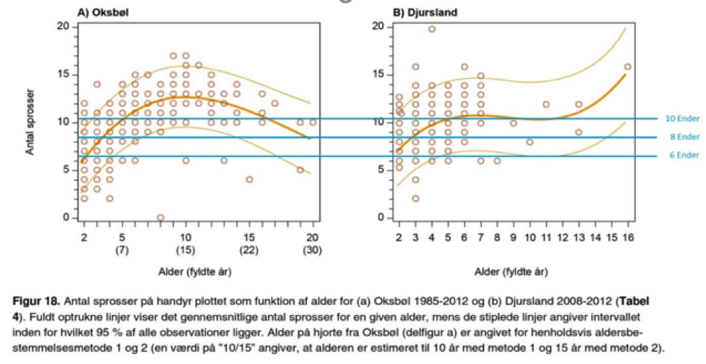 I Oksbøl, hvor adgangen til markafgrøder er ringere end på Djursland og hvor fodringsintensiteten formentlig også er mindre, ses en tydeligere sammenhæng mellem alder og sprossetal end på Djursland, hvor hjortene i en tidligere alder når det maksimale sprossetal.