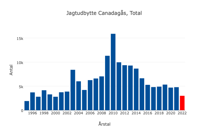 I følge DCE’s informationer toppede udbyttet med knap 16.000 i sæsonen 2010. I jagtsæsonen 2022 indrapporterede de danske jægere færre end 3.000 canadagæs til DCE.