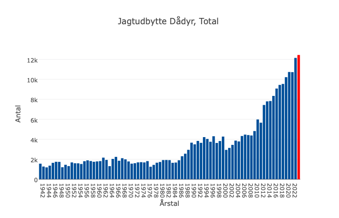 Afskydningen af dåvildt udviser en bemærkelsesværdig udvikling, som startede i 1985. Før denne tid lå antallet af nedlagte dåvildt under 2.000 om året, med enkelte sæsonmæssige undtagelser. Siden da er antallet steget voldsomt.