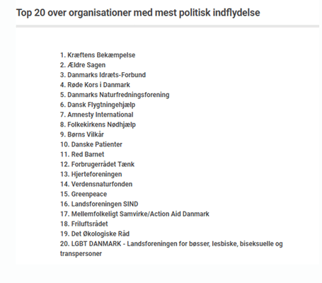 I hvert fald hvis man skal tro Altingets nye magtanalyse af danske civilsamfundsorganisationer. Her indtager foreningen en fornem 5. plads, alt imens Kræftens Bekæmpelse og Ældre Sagen topper listen.