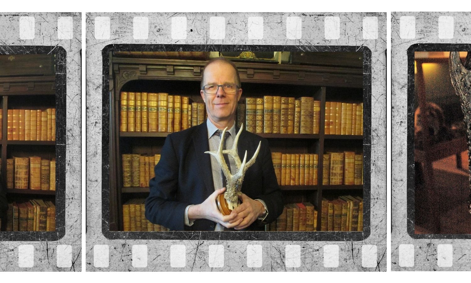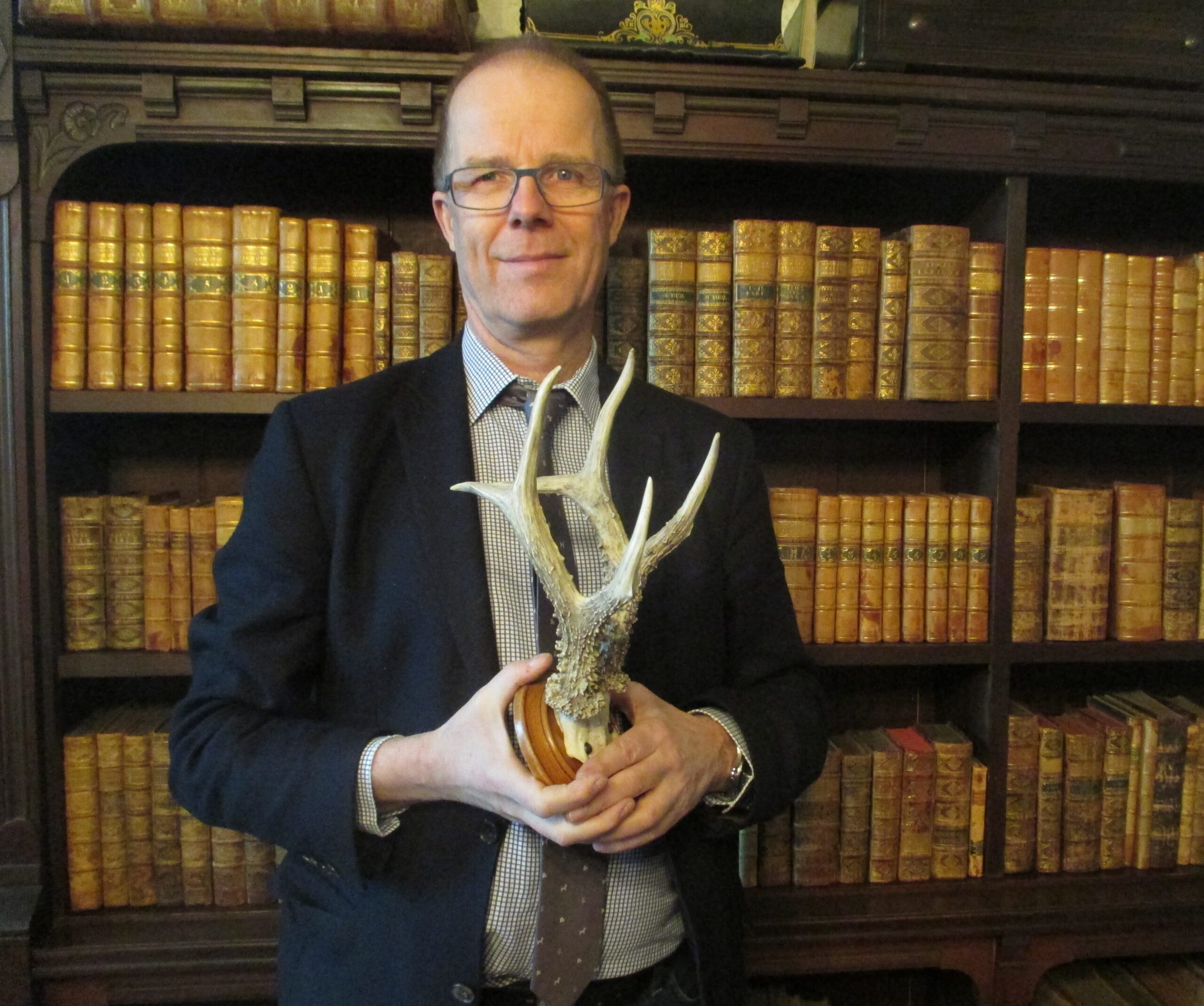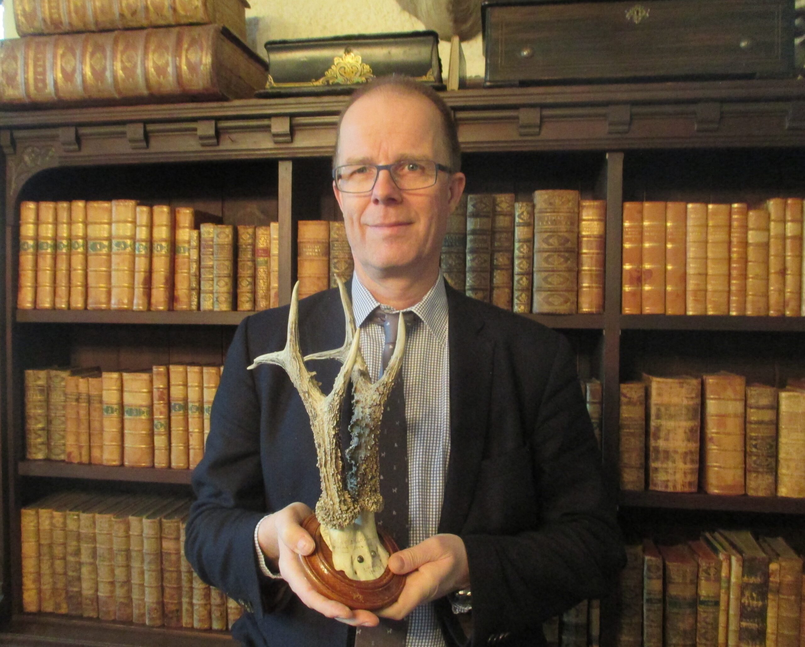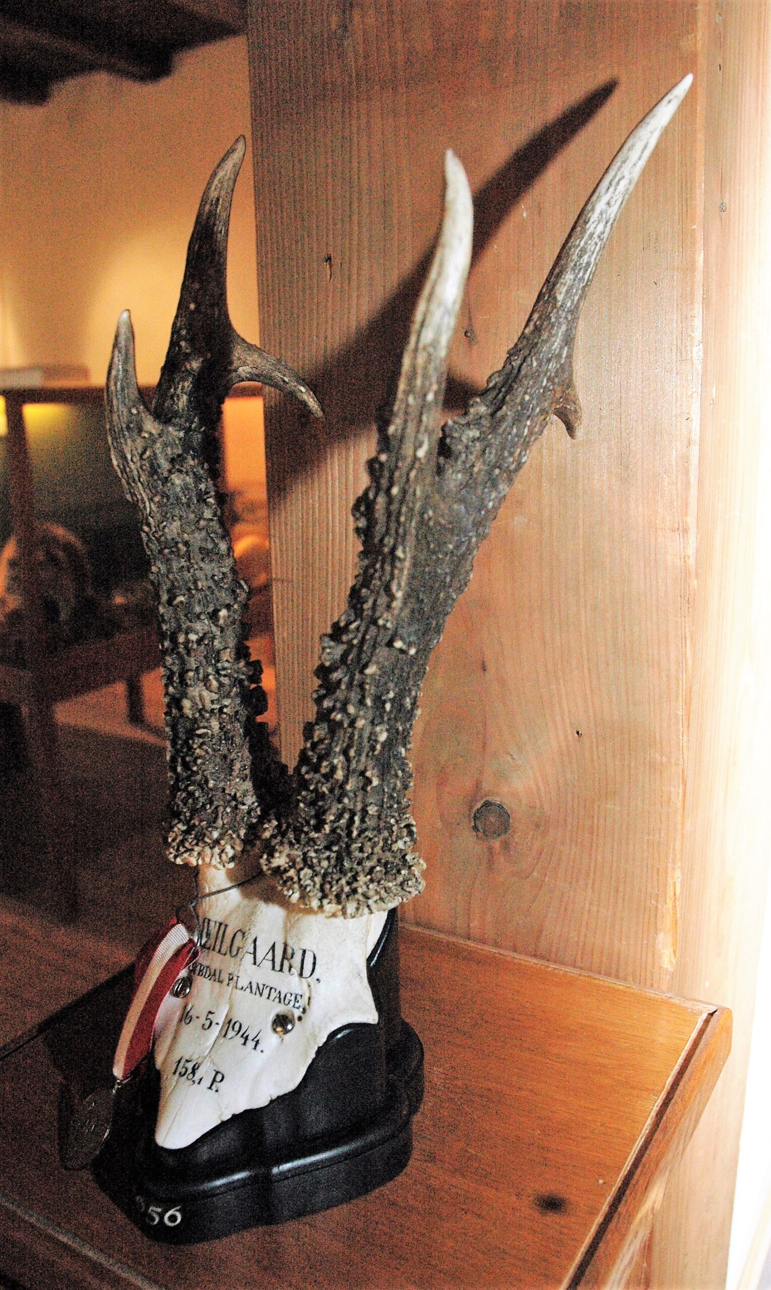 Denne opsats fra 1918 på 153,9 point, som Christian baron Wedell-Neergaard her viser frem, blev en ny milepæl i dansk bukkejagt. Den var Danmarksrekord i 26 år indtil 1944, og er stadig den største bukkeopsats i Svenstrup-samlingen. Foto: Henning Kørvel