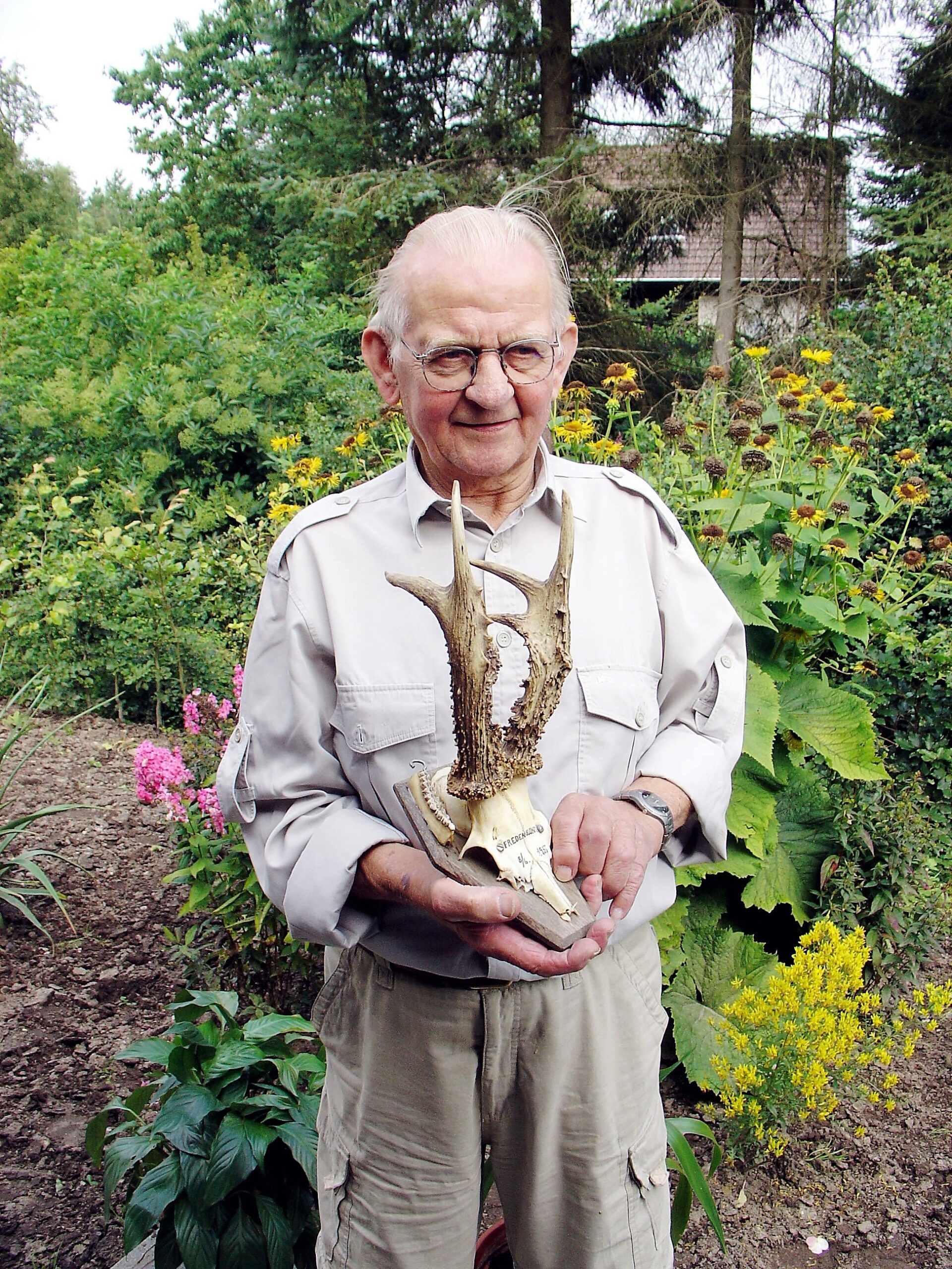 Afdøde Jens Hjort ses her i 2005 med den stærke opsats fra sin far, Knud Hjorths buk. Fordi den først blev opmålt i 1956, er det ikke utænkeligt, at den har færre point, end hvis den var blevet opmålt 90 dage efter, at den var blevet afkogt og renset i 1955. Privatfoto