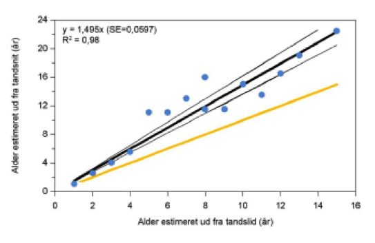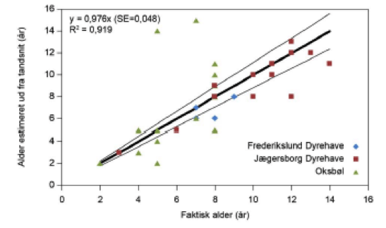 4.) Særligt bekymrende er det, at det tydeligvis er dyrene fra den fritlevende bestand i Oksbøl -området (grøn trekant), der ligger mest spredt, og dermed viser den dårligste korrelation mellem kendt alder, og alder vurderet ved tandsnit.