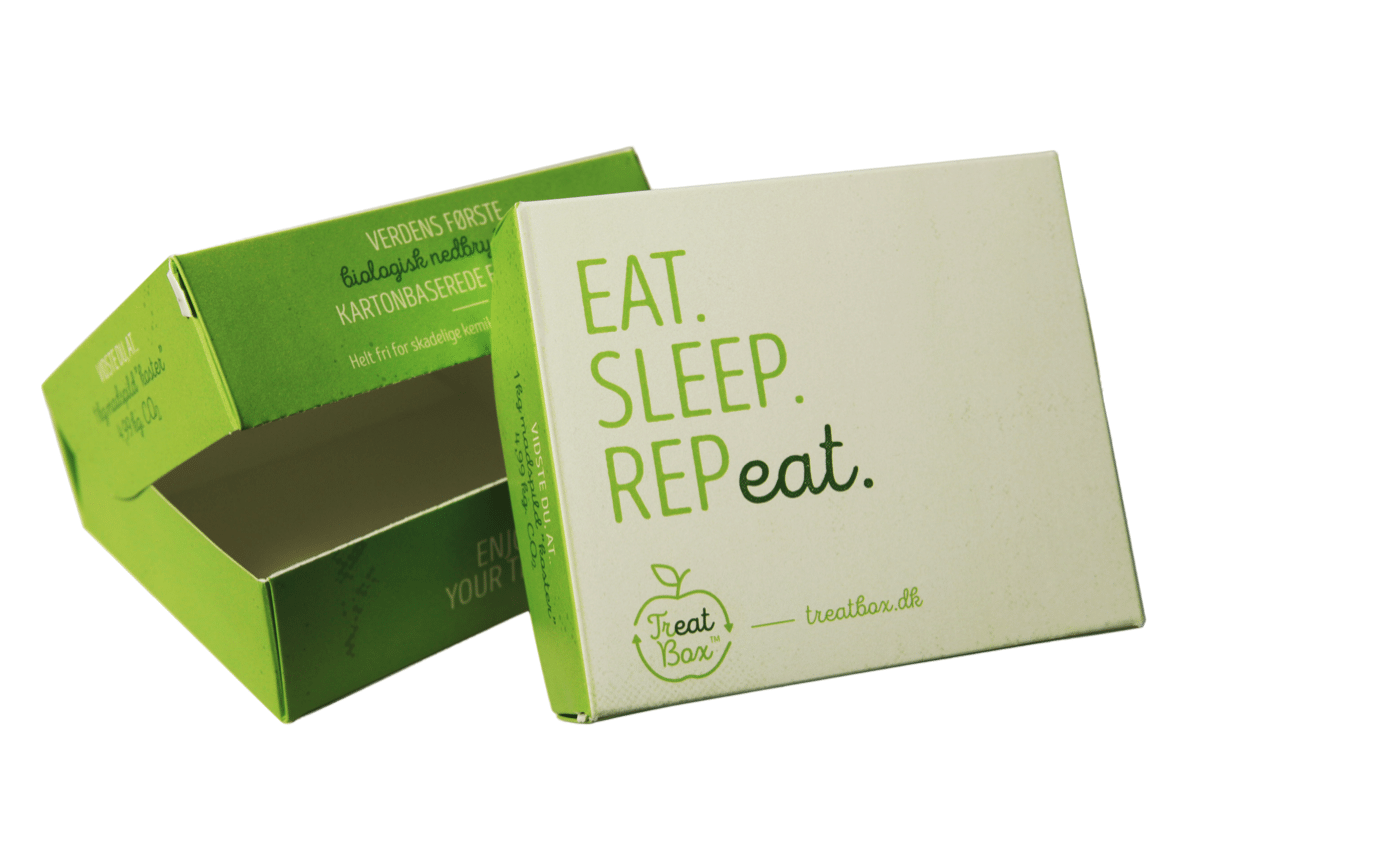 TreatboxTM er en bæredygtig løsning på flere fronter. Udover at spare ressourcer til tilberedning af mad og bortskaffelse af affaldet – så er selve æsken også bæredygtig. Den er produceret hos KLS Pureprint, som er specialister inden for bæredygtige tryksager og emballager: ”Æsken er 100 procent biologisk nedbrydelig, den indeholder ingen skadelige kemikalier eller tungmetaller i æsken – og den er godkendt til at være i direkte fødevarekontakt,” siger Jakob Thomasen, Nordisk Salgschef i KLS Pureprint. Han uddyber: ”Det er rigtig vigtigt for os, at der er sammenhæng mellem det, som vi siger, og det vi gør. Så selvfølgelig skal en æske mod madspild være bæredygtig.”