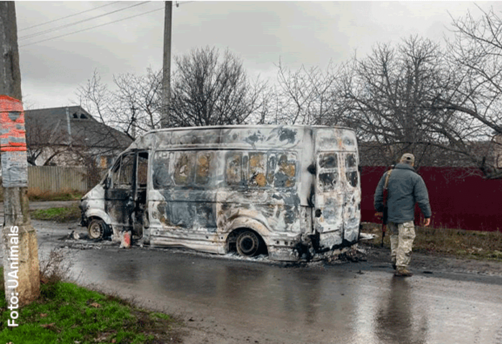 Dyreambulance i krigszonen i Ukraine er blevet ramt og brændt ned og nu efterlyses der midler til ny ambulance til dyr i krigszonen