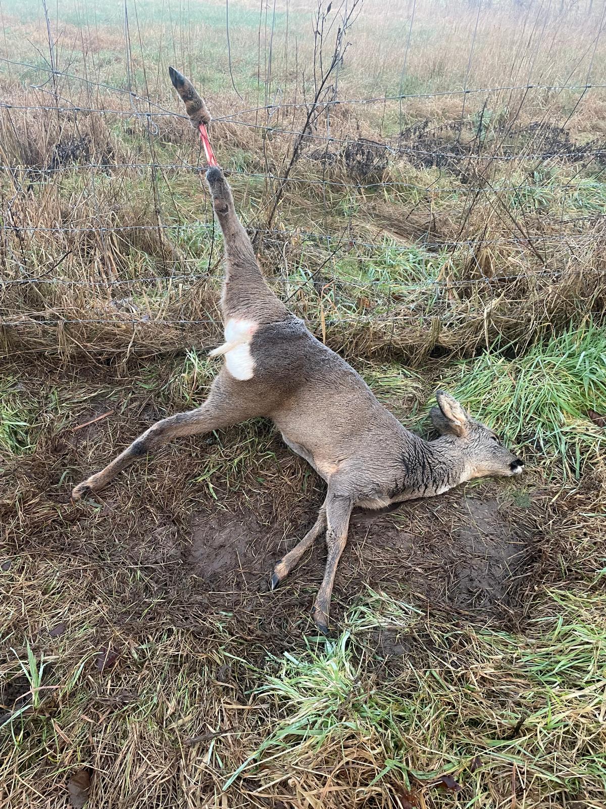 Som det ses mangler dyret en del af nederste højre bagløb. Det er uvist hvorfor, men dette handicap kan være årsagen til at dyret ikke evnede at forcere vildthegnet og derfor blev fanget i hegnet …