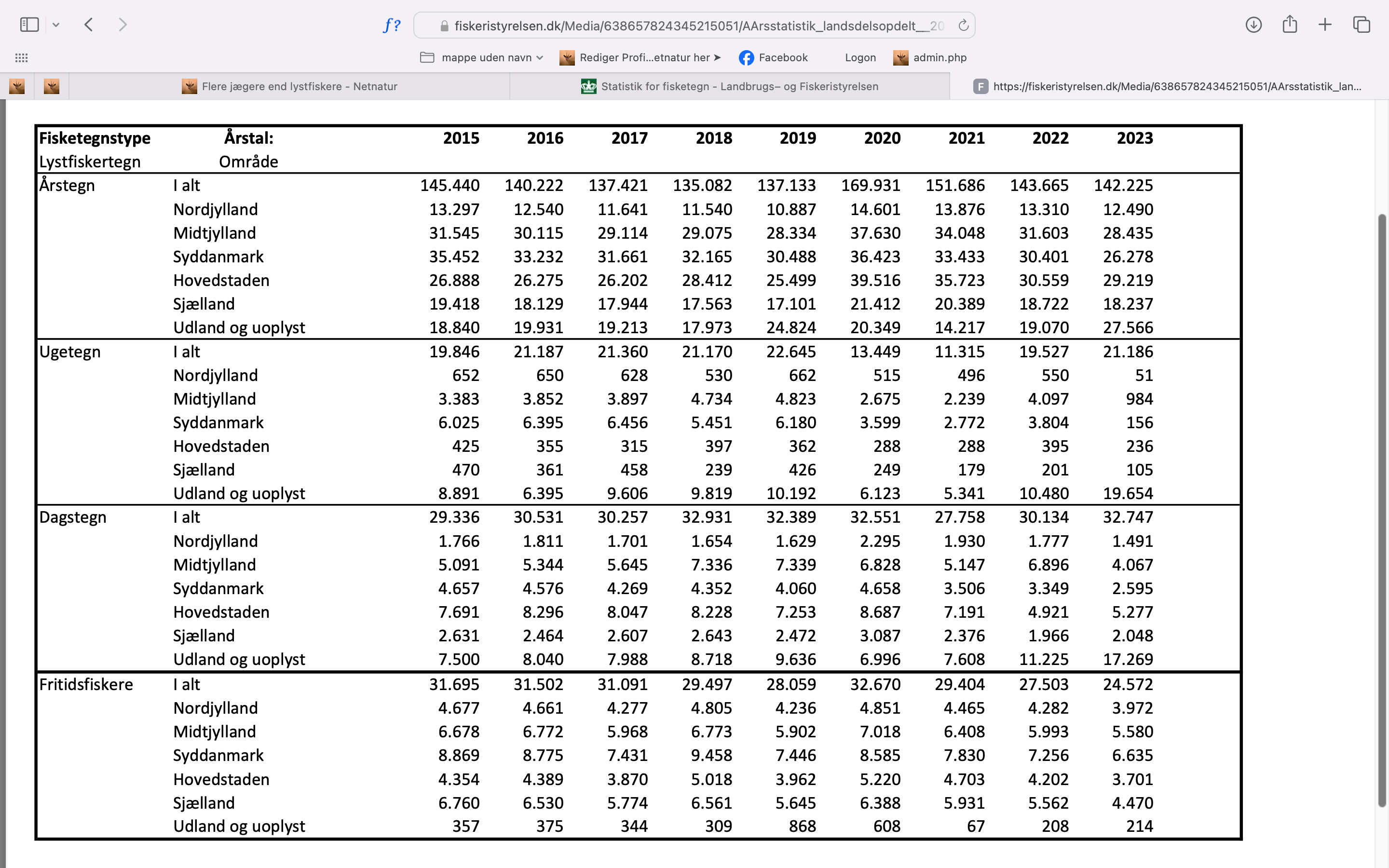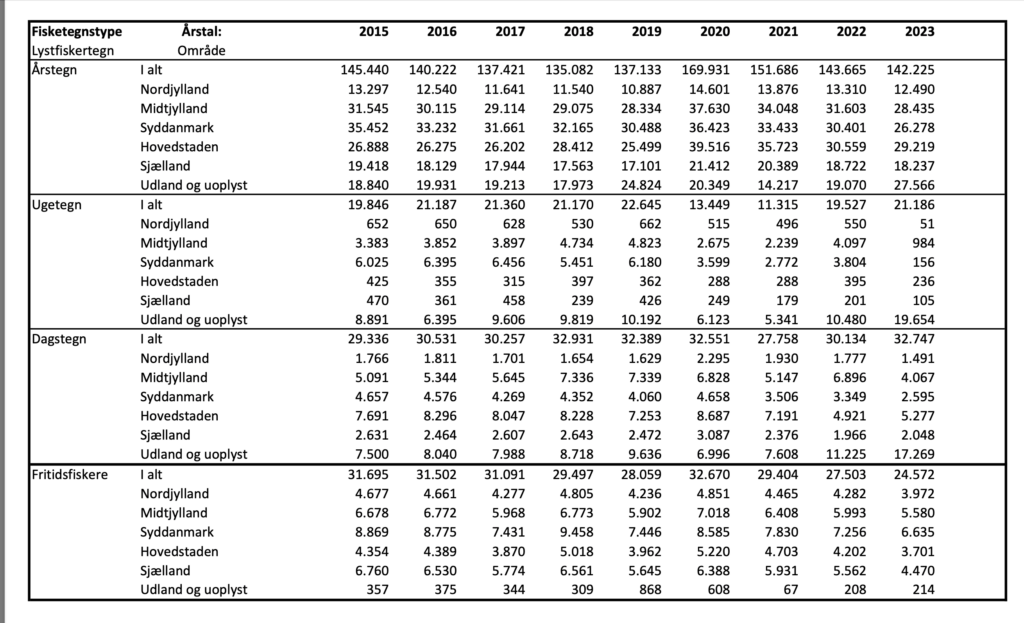 I 2020 var der næsten dødt løb mellem antallet af de to naturbrugergrupper. I 2022 var der dog kun “143.665” der indløste års-fisketegn. og i 2023 er tallet faldet en smule og er nu opgjort til 142.225. Sammenholdt med indløste jagttegn er jagt dermed stadig mere populært end lystfiskeri.