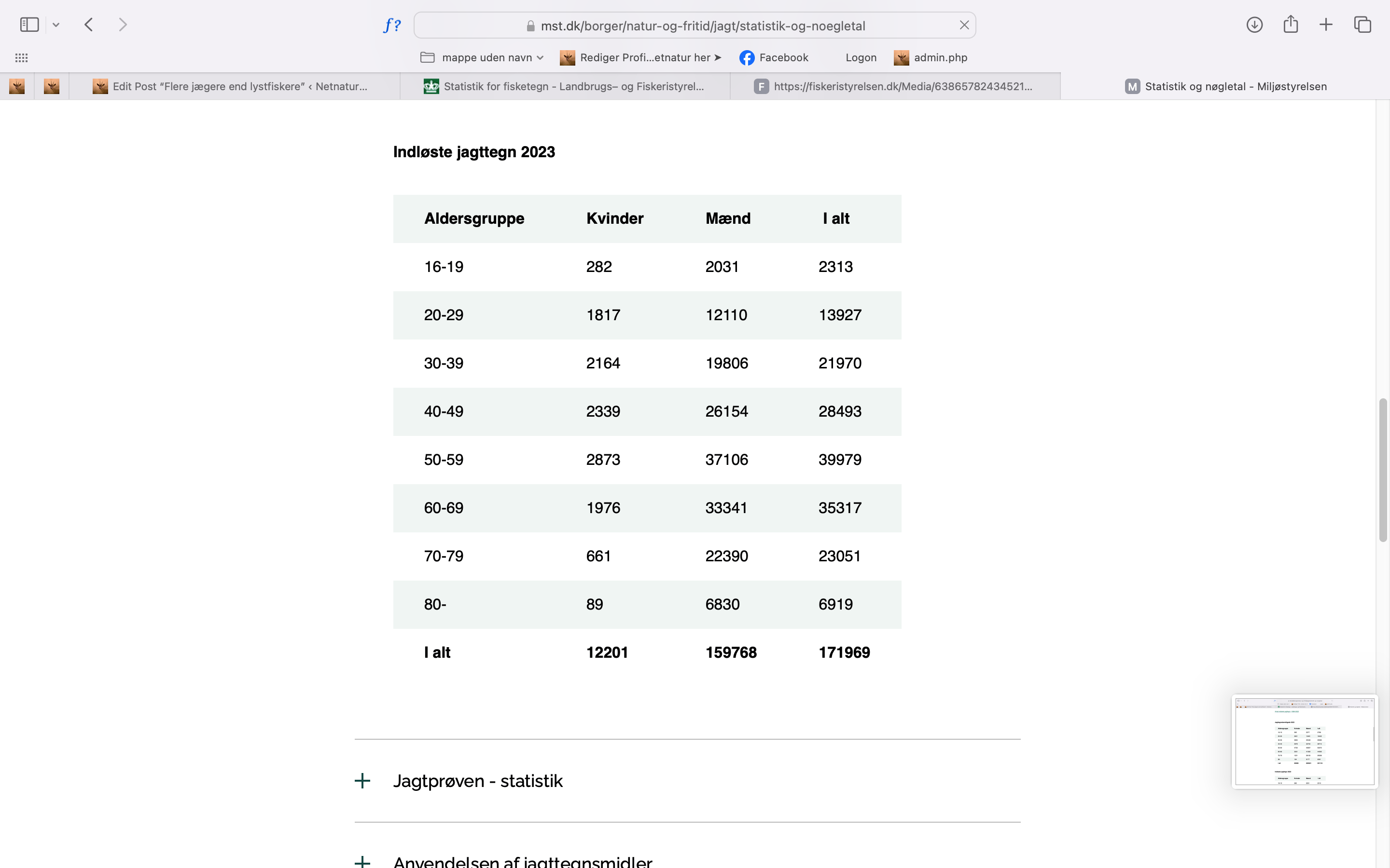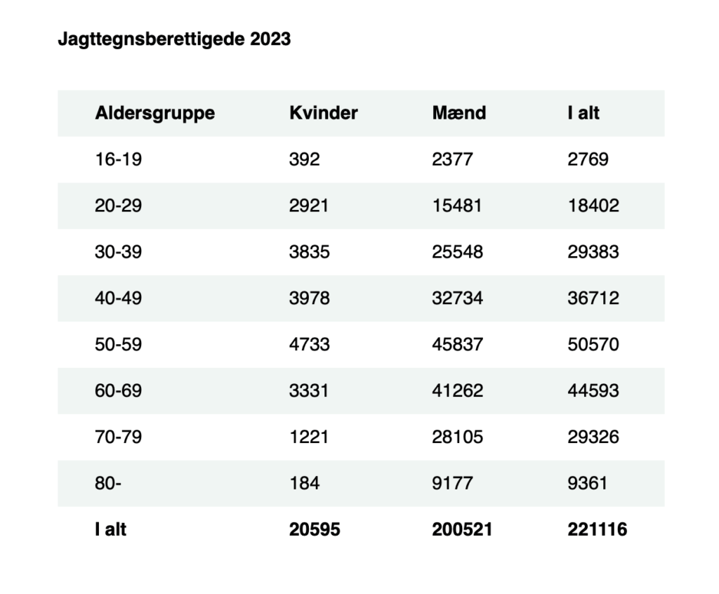 Den seneste opgørelse viser, at der i 2023 blev indløst ikke færre end 171.996 jagttegn i Danmark. I 2009 var antallet godt 168.000 indløste jagttegn og godt 228.000, når man ser på antallet af personer, som dengang havde ret til at indløse jagttegn.