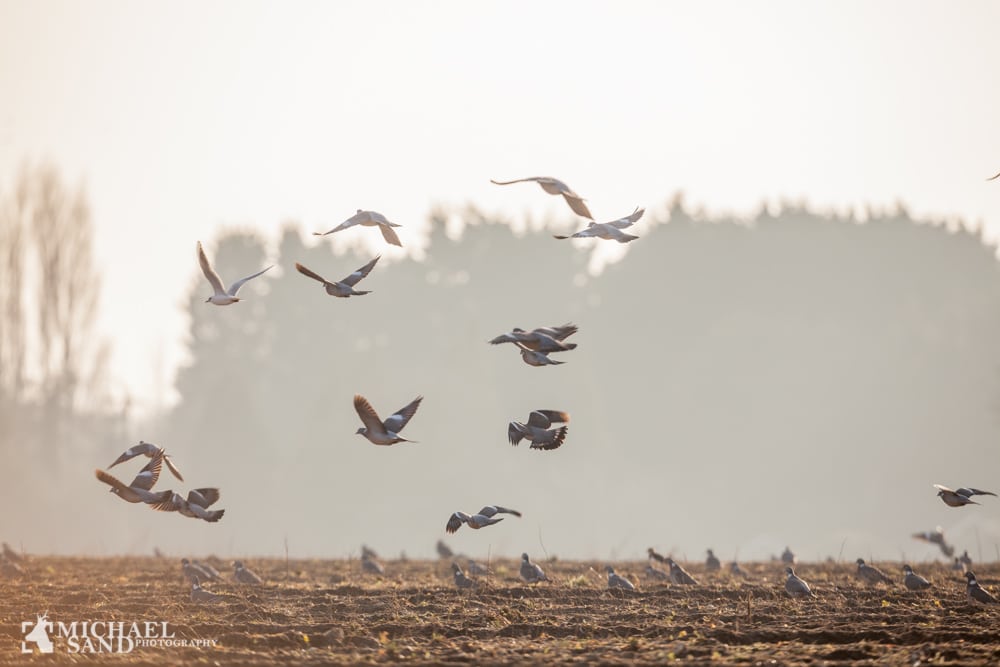 Et andet eksempel er de tre fasankokke på billedet her til højre. Igen har Michael Sand forsøgt at holde ISO så lav som muligt. Ydermere står fasanerne forskudt i forhold til hinanden, så for at få dem alle skarpe, må der vælges en mindre blænde (større dybdeskarphed). Når der lukkes mindre lys gennem objektivet, og signalforstærkningen holdes nede – må resultatet blive at lukkertiden skal forlænges. Dette har betydet at alle fasanerne nåede at bevæge sig og billedet kan kasseres.