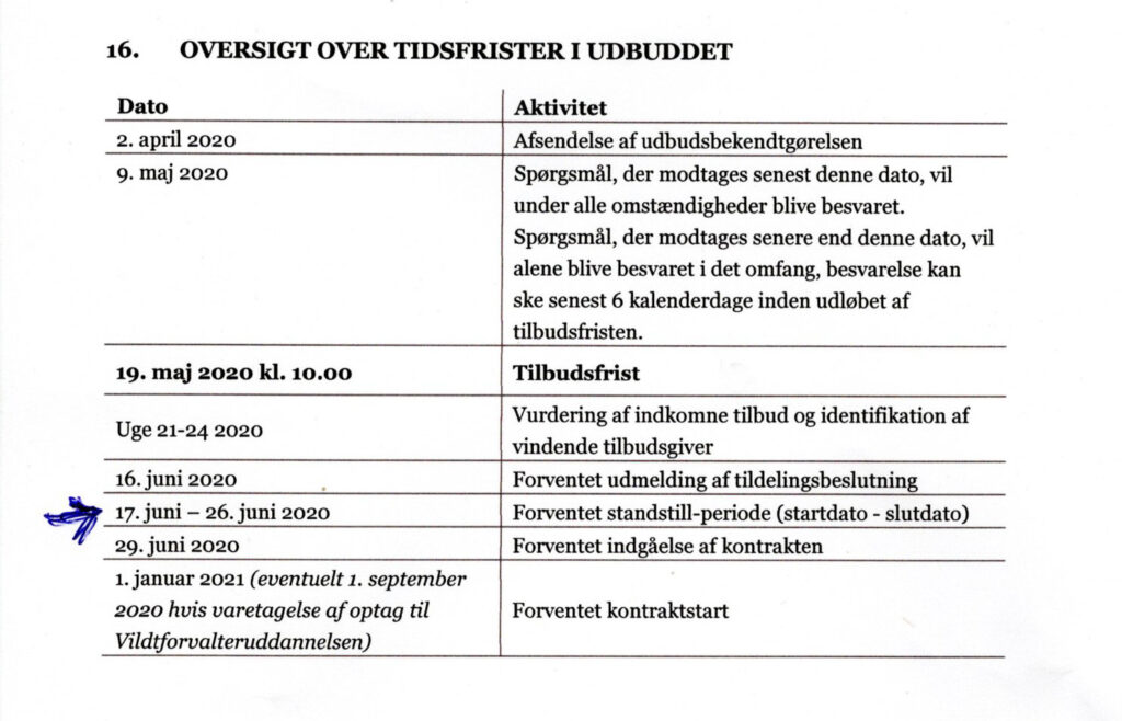 I ”OVERSIGT OVER TIDSFRISTER I UDBUDDET” fra Miljøstyrelsen uder Miljø-og Fødevareministeriet, står der: