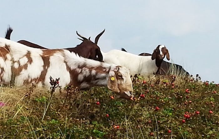 – En enkelt plante af rynket rose kan på et enkelt år brede sig en meter frem i landskabet. Rynket rose, som kaldes hybenrose i folkemunde, er især et problem nær kysterne, fordi den er meget hårdfør overfor både salt og vind – og så tåler den ovenikøbet at blive dækket af et tykt lag sand. At sætte geder ud er en af de metoder, vi nu afprøver for at få bugt med dem, siger skovrider Thomas Borup Svendsen fra Naturstyrelsen i Vestjylland.