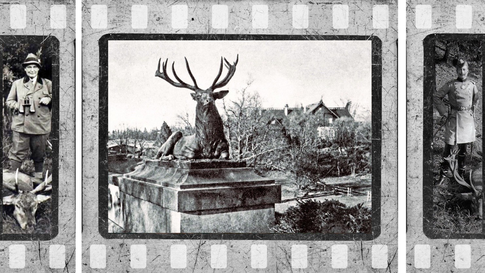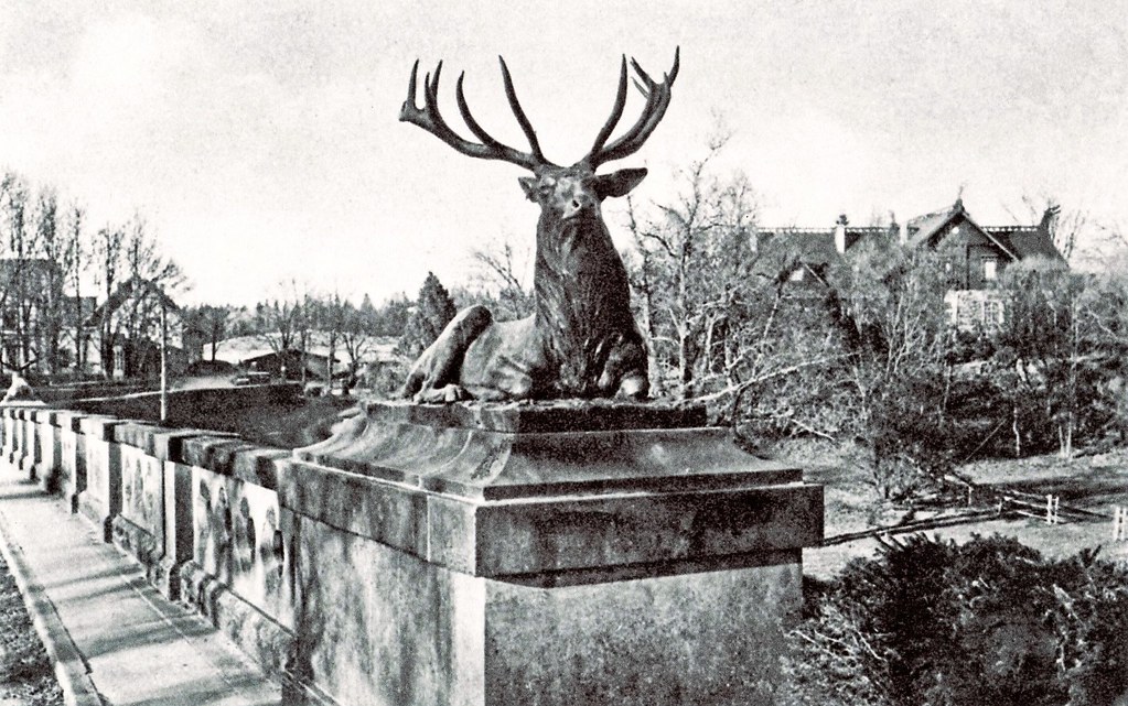 Kronhjorteskulpturen ved kejserens jagthytte. Den findes i dag i Glinka Park, Smolensk.