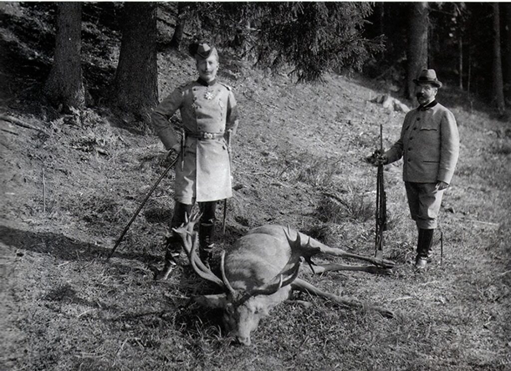 Kejser Wilhelm II ved en kronhjort, han nedlagde i Rominter Heide. Han skød i alt 321 kronhjorte i reviret.