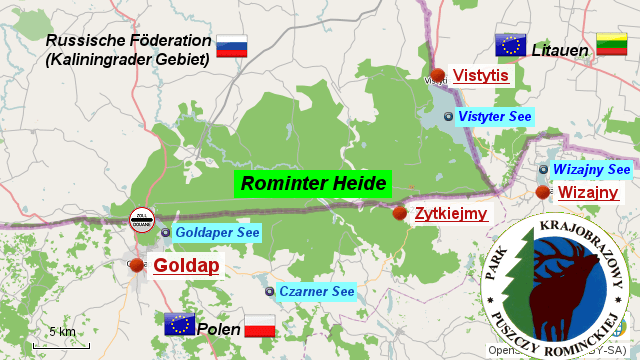 Kort over Rominter Heide, hvoraf fremgår, at to tredjedele ligger på russisk territorium og en tredjedel er polsk. En noget mindre del af skoven ligger i Litauen.