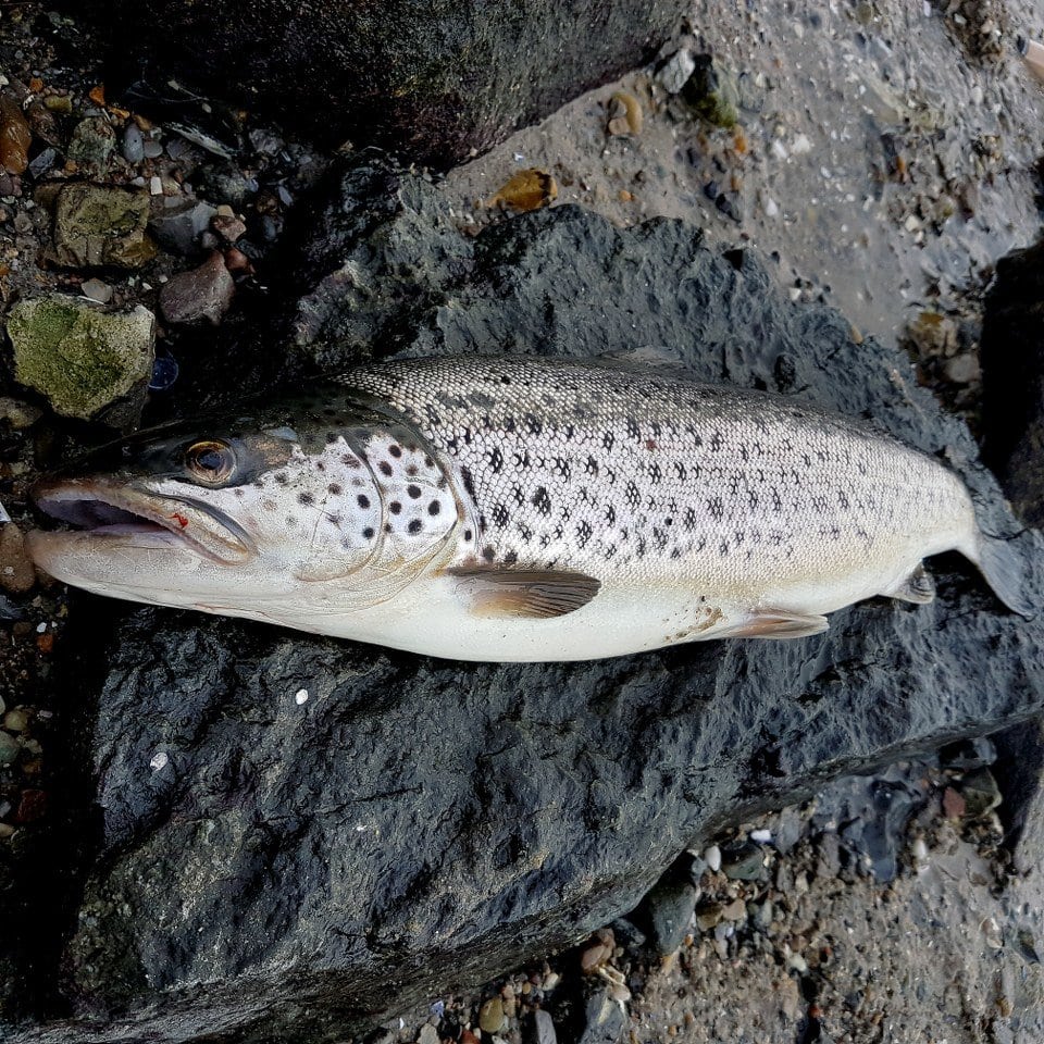 Efter lidt tovtrækkeri på det lave vand, kan jeg ane en nedfaldsfisk omkring de 60 cm. Ind til en hurtig afkrogning i strandkanten, hvorefter den bliver sendt retur på sin æde togt i fjorden.