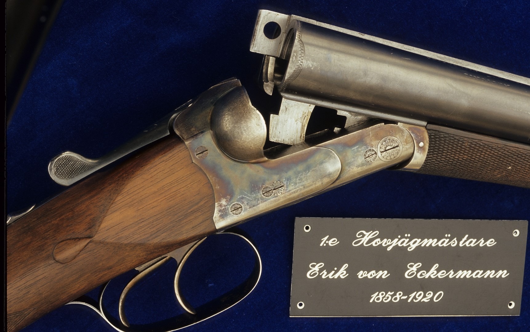 Her ses Erik von Eckermann i uniform og forrest til venstre Husqvarna model 310/Eckermann, og ved siden af denne dobbeltriflen i kaliber 9,3x74R, som Eckermann fik i 60-års gave af Husqvarna Vapenfabriks Aktiebolag. Den første model 310/Eckermann er stadig i familiens eje.