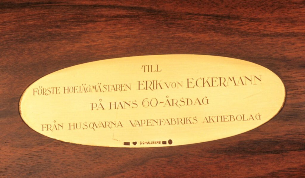 Plakette på skæftet af dobbeltriflen med den informative tekst, at den blev givet til Erik von Eckermann, da han rundede 60 år.