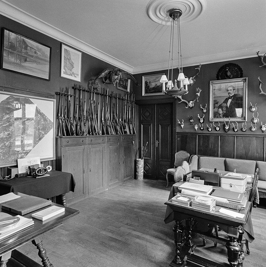 Et kig ind i jagtrummet på Edeby Gods. Rifler og haglbøsser stod på den tid frit fremme, men i dag skal de heldigvis opbevares i våbenskab. I Danmark har jagtvåben skullet stå i våbenskab siden 1996.