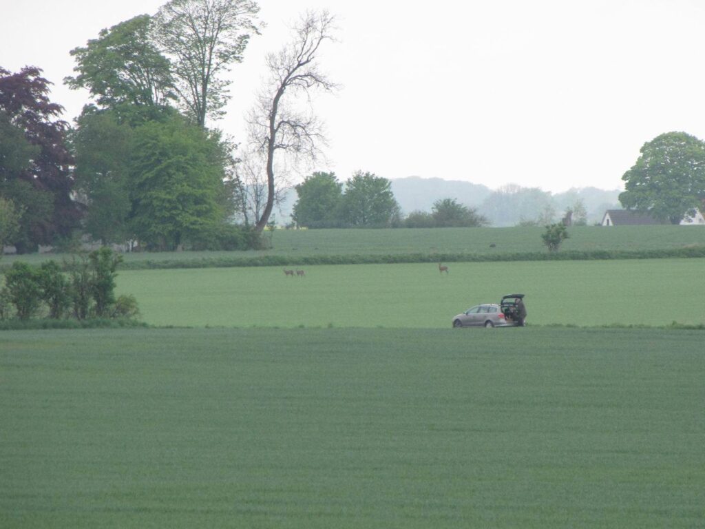 Sådan så det ud i Terslev i 16.05.12. Jægeren læsser en skudt buk i bilen, og bag ham kunne tælles 6 stykker råvildt. – Kommer man til at opleve et sådan syn igen?