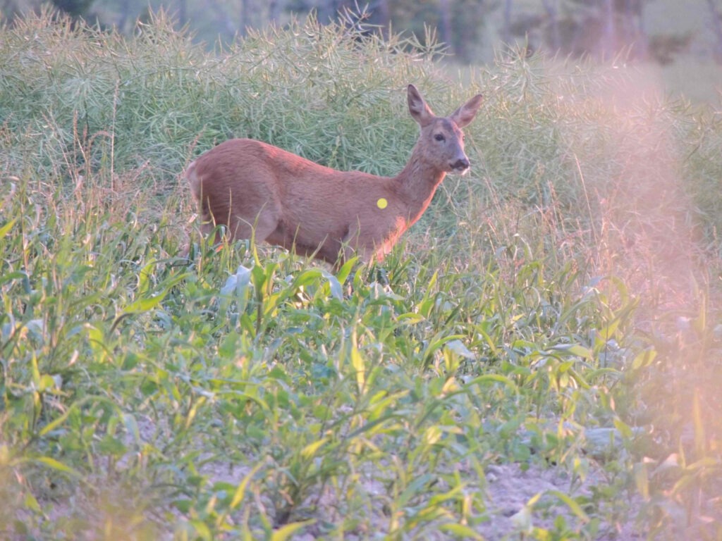 Buk den 25.05. – Den gule prik på dyret er CNS- kuglen, ved næsten vandret kuglebane, og hvor dyret står let skråt imod skytten.