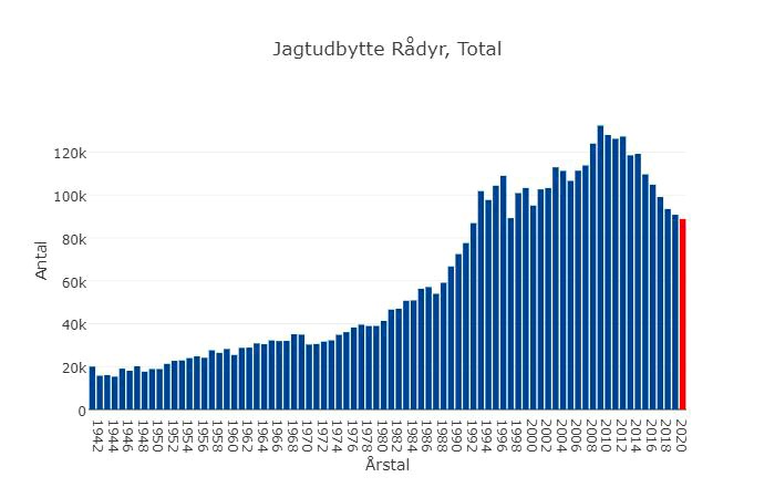 I henhold til Vildtudbyttestatistikken, blev der i 2009 (da vor råvildtbestand startede sit bestandsfald) skudt 6.928 stykker kronvildt, og i 2021 blev skudt 9.700.