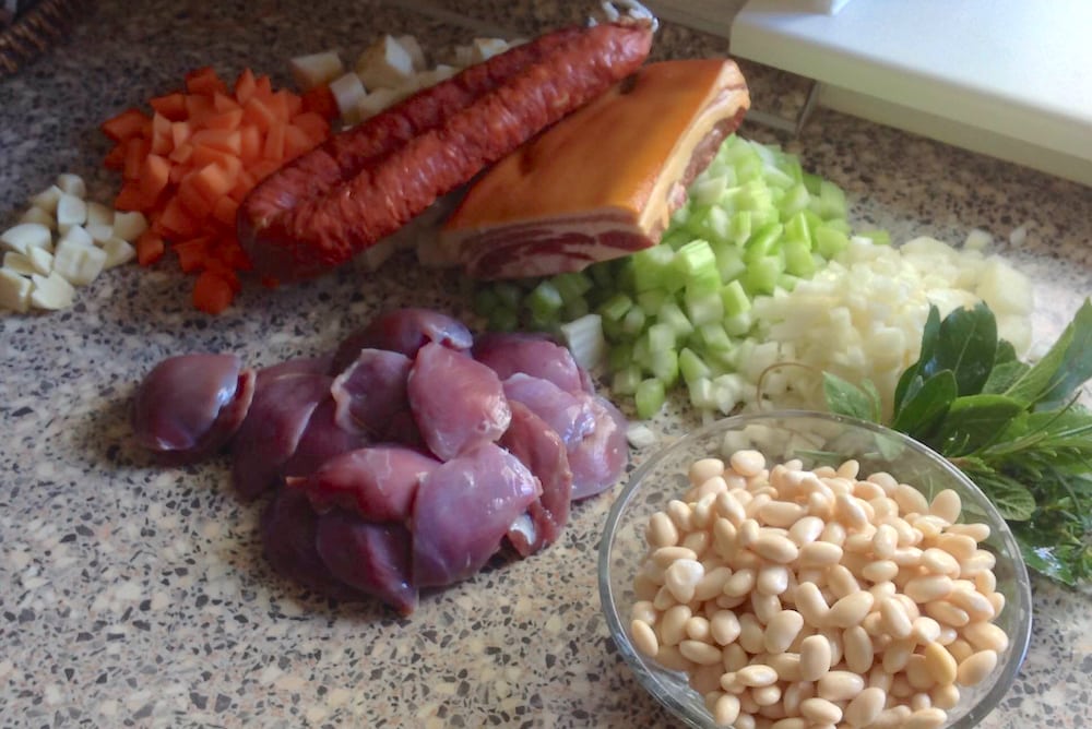 Bønnerne koges i ca. 45 minutter med hakket bladselleri, løg, og hvidløg, der dækkes af hvidvin og kalvefond samt evt. lidt vand. Har du ikke fond, kan du bruge en “bouillon-terning” i stedet.