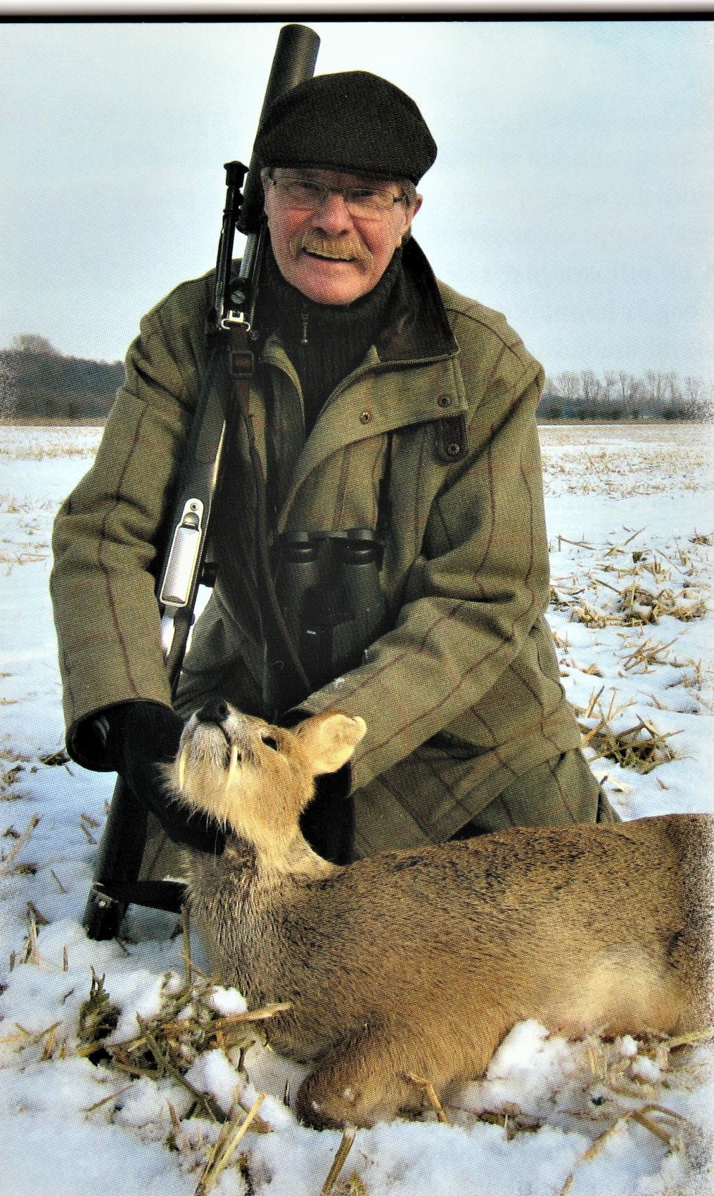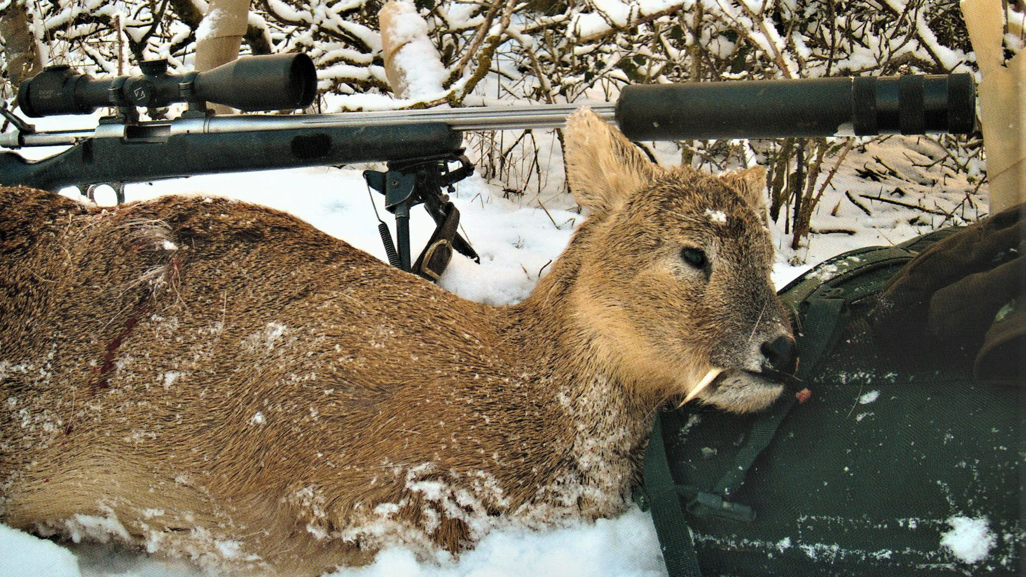 Vi spotter en buk 400-500 meter ude, og Paul gør tegn til, at vi skal prøve at kravle ind på skudhold af den. Snart er vi på vej på alle fire, men jeg finder hurtigt ud af, at Laksens skydehandsker, der er fortræffelige til riffel- og haglbøssejagt i tørt vejr, ikke er velegnede at kravle i sne med, fordi de ikke er vandtætte og snart bliver gennemblødte, hvilket ikke er optimalt for hænderne i betragtning af, at det fryser over en halv snes grader, men pyt. Hvilke ofre bringer man ikke gerne for at få opfyldt sine drømmes mål?