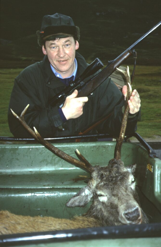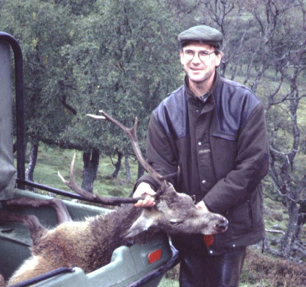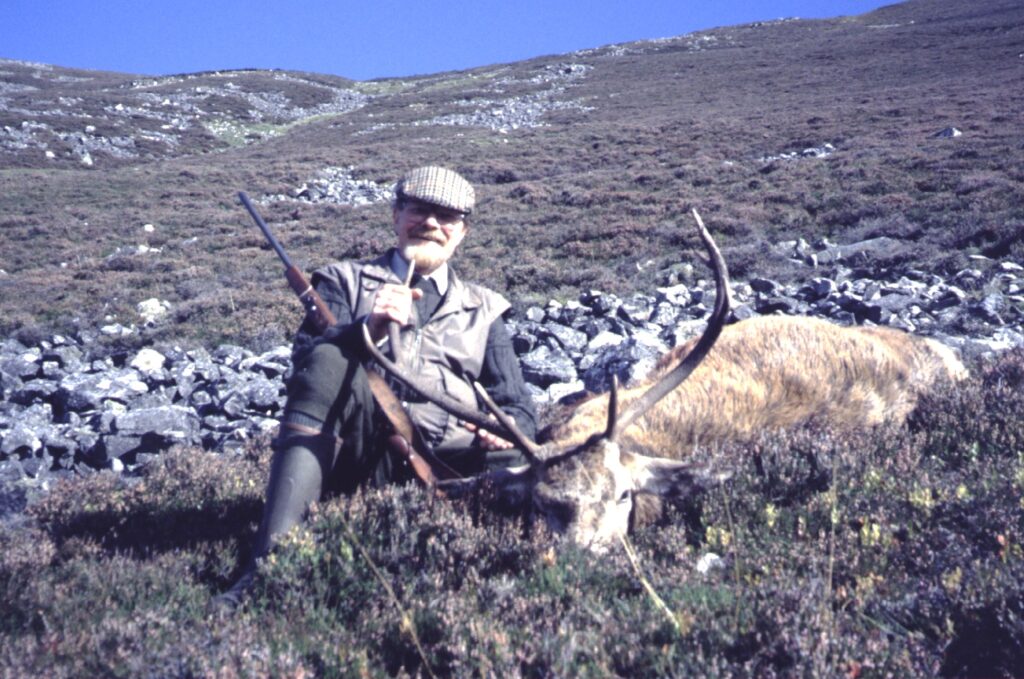 Stalkeren David med Henning Kørvels første hjort, der har fået tilnavnet Kronprinsens hjort, fordi kronprins Charles, nu Kong Charles III, ønskede ham tillykke med den.