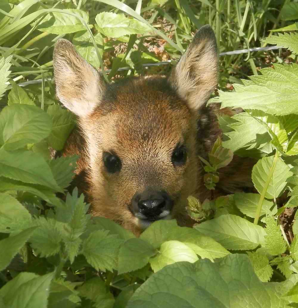 Foto D. – 25.05.2010 i Ringsted. Råen fik, mens hun gik rundt, pludseligt veer og sank næsten helt i knæ, hvorefter hun søgte i skjul – formentlig for at føde.- Denne rå blev formentlig beslået ca. 10 mdr. før, altså ca. sidste uge i juli sidste år.