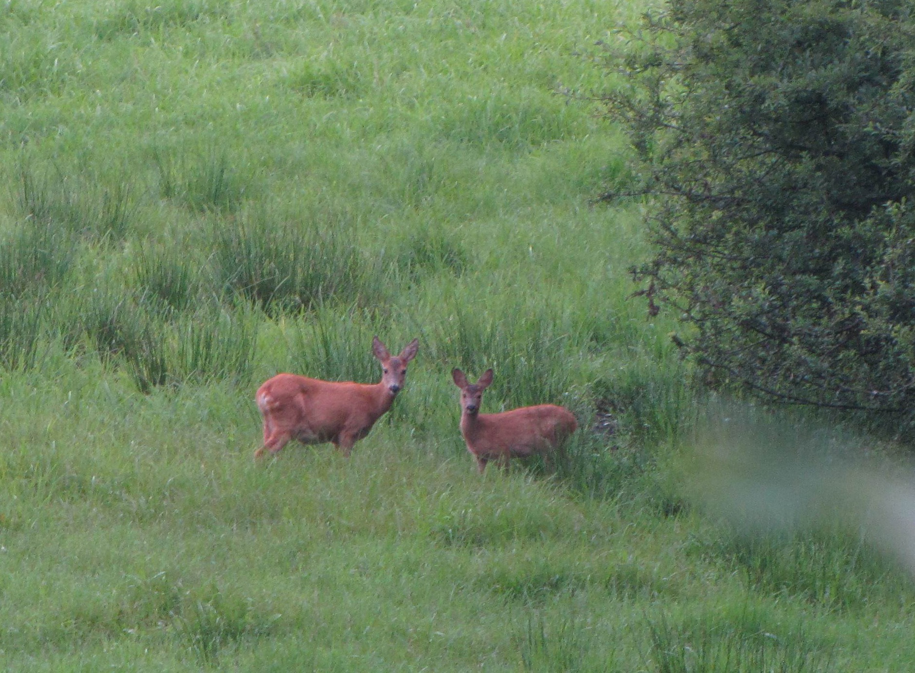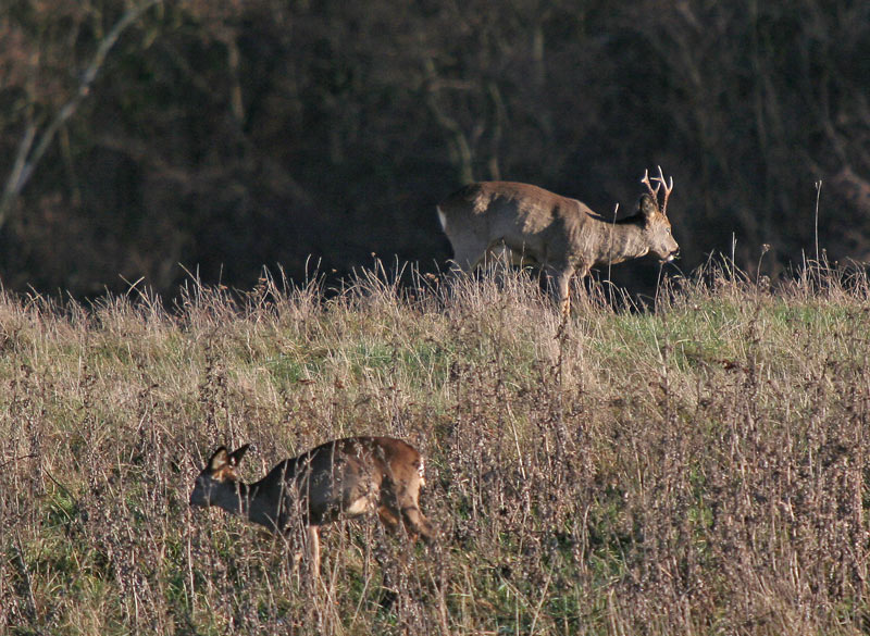 Foto G. – Ældre buk og rå sammen i Haraldsted, Sjælland, den 16.05. – En 1- årig buk er først fertilt aktiv i en alder af 13-14 mdr., så han ville ikke kunne ses gå rundt sammen med en rå, som ikke er hans mor, hér den 16.05. – I dagene op imod råens brunst, holder bukken sig tæt ved hende hele tiden, hvorimod han ofte uger før besøger hende jævnligt, for at kontrollere hvor langt hun er i brunsten, men nok også for at gøre hende interesseret i ham og tryg ved ham.