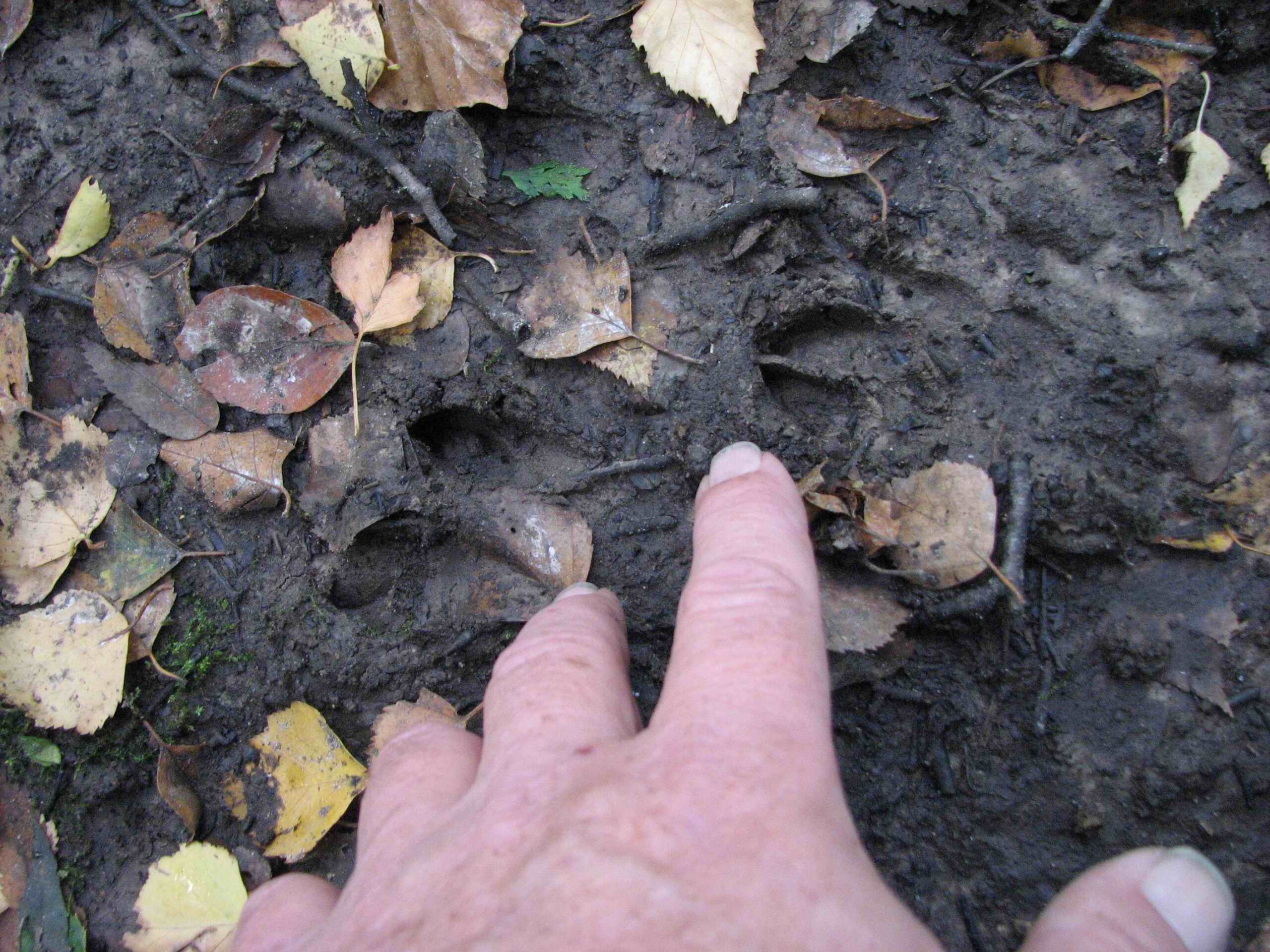Foto C. – Hér ses helt frisk fod efter en rå med hendes meget lille lam den 7.10.2007 i Kærhave Skov. Min fingernegl er 10 mm bred, så dette lams klove (finger/tå 3 og 4) er 11-12 mm brede i deres tykkeste dele, og ca. 22 mm i længden. Denne rå kan være beslået i perioden 16. nov. til 23. nov. sidste år, når samlet drægtighed er 10 mdr. Er dette lam 1 mdr. ældre end jeg tror, blev råen beslået i perioden 16. Okt. til 23. Okt. sidste år. Særtilfælde? – sikkert nok, men vi ved det jo ikke.