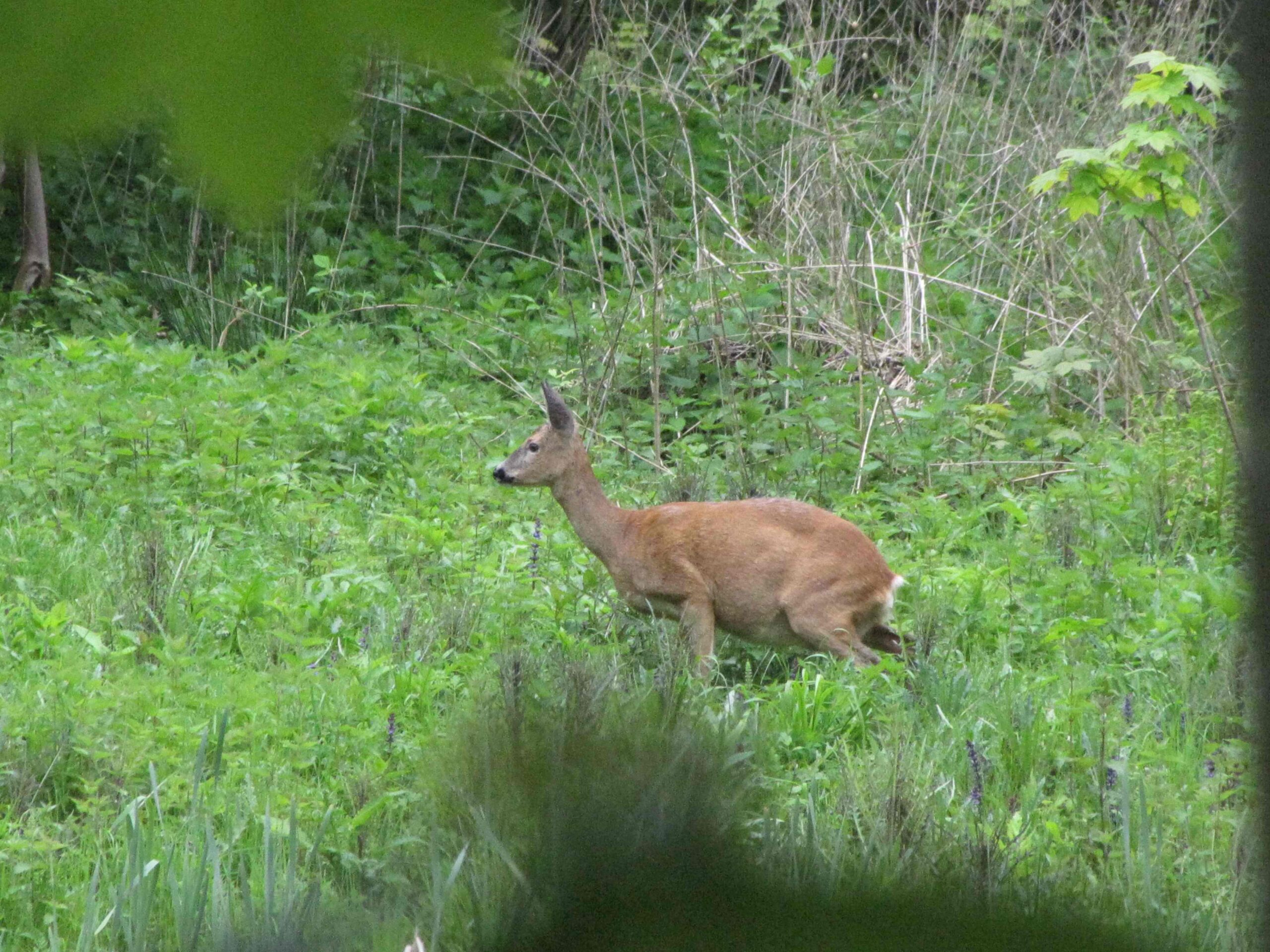 Foto E. – En meget drægtig rå den 18.05. på Møn. Dette er et meget almindeligt syn på mange jagtarealer. Hér gætter jeg på tvillinger, da jeg næsten måtte hjælpe hende ind i skoven. – Denne rå er beslået omkring den 20.07., ved 10 mdr. drægtighedsperiode.