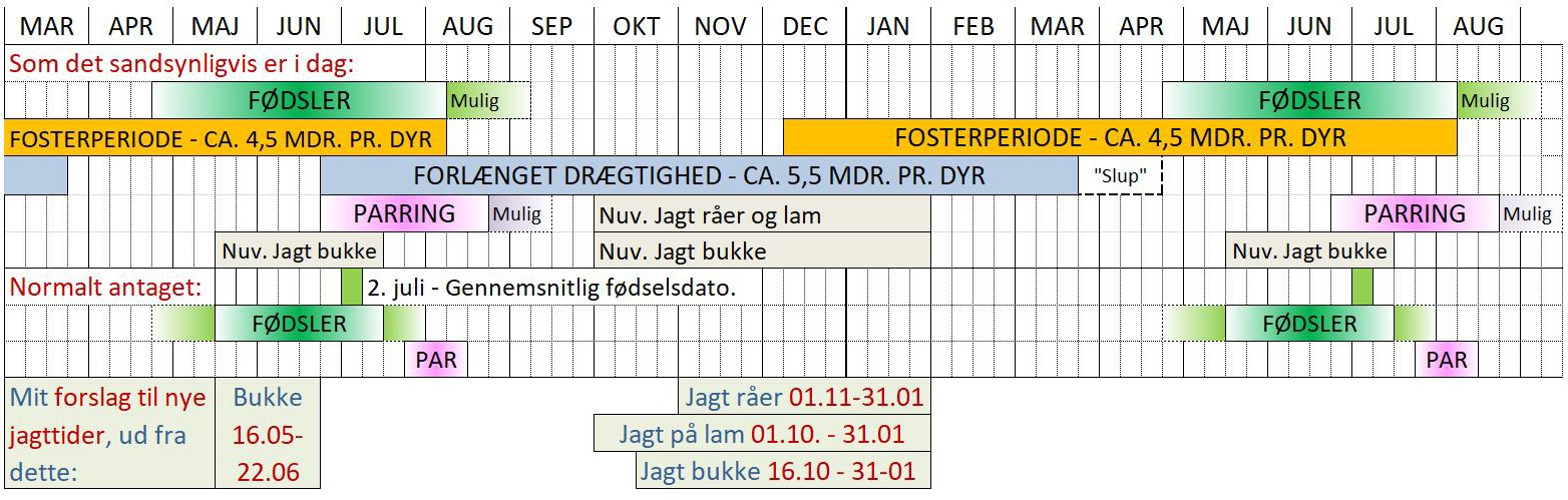 Illustration F. Kalender med årets fødsler, parring mv. Som det ses er der meget stor forskel på de normalt antagede fødsels,- og parringsperioder i forhold til hvad jeg mener at kunne dokumentere hér. Og hovedbudskaberne hér er vel, at bukkene beslår råer i langt længere periode end man antager, og at råerne sætter lam langt senere end man antager. Hvis sådan, er dette virkeligt noget som har indflydelse på bestandsforvaltning, herunder også tanker omkring at flytte bukkejagten til Aug./Sept.