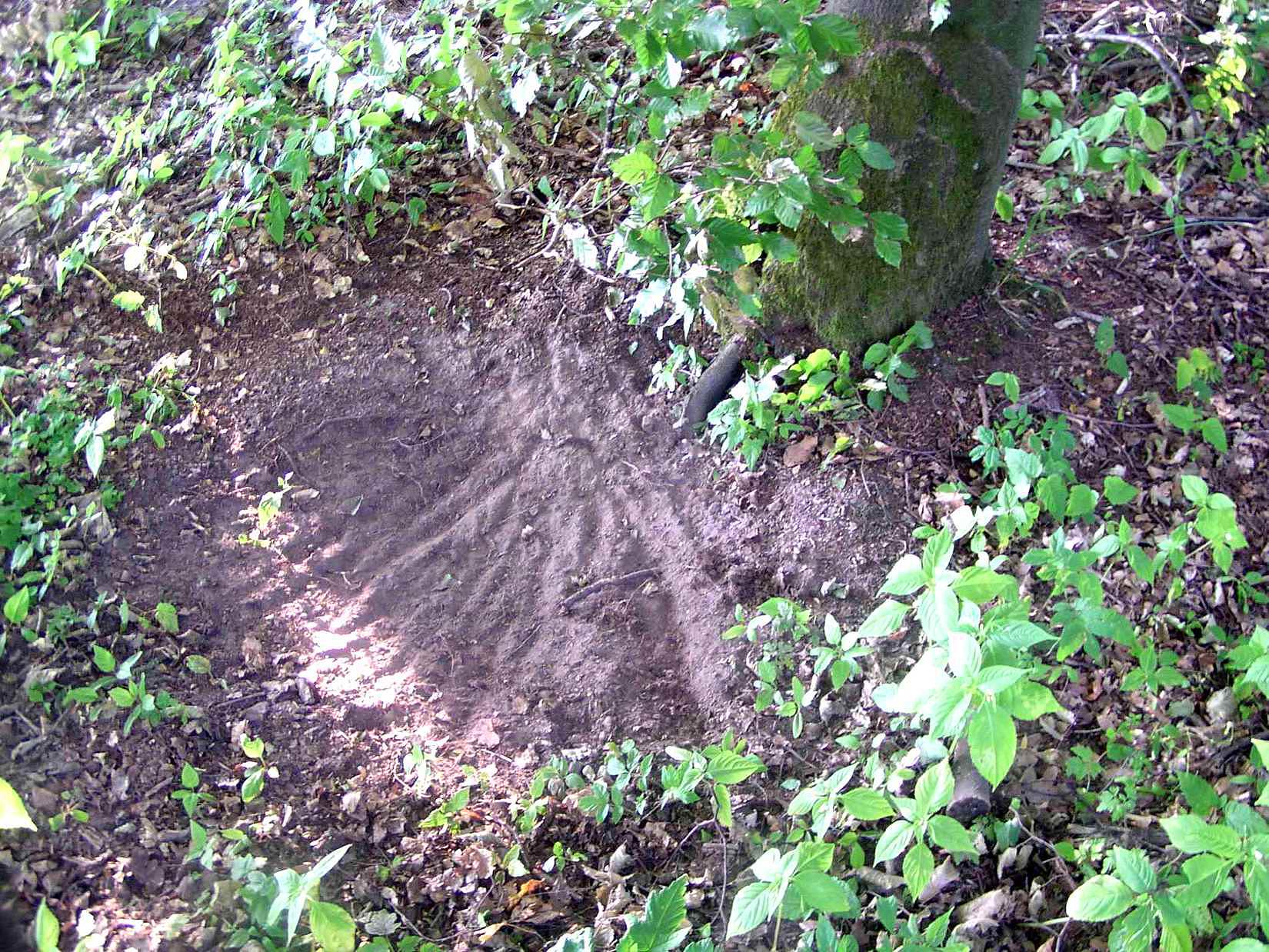 Foto H. – Bukkens W-skrab den 02.07., og han har også urineret lidt. Dette er nok en ældre stærk buk, som altså hér er i gang 02.07. med kraftig parringsmæssig adfærd, som i henhold til almindelig antagelse først skulle finde sted fra ca. 20. juli til medio august.