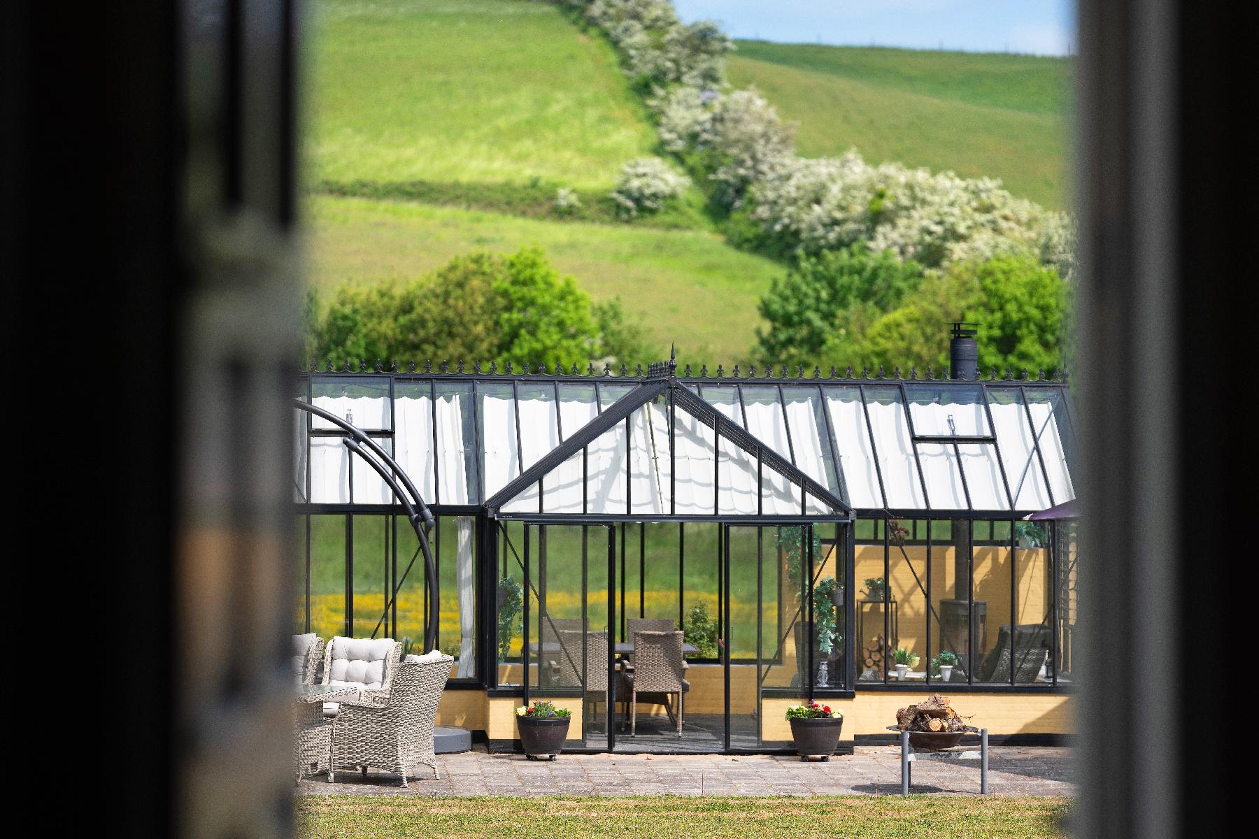 I en hyggelig krog af den store have er der opført et 27 kvadratmeter orangeri, hvor I året rundt kan nyde de smukke omgivelser og se dyrene, der krydser grunden og fuglene, der glider gennem luften. Orangeriet er indrettet med brændeovn, el, vand og kloak til udekøkken.