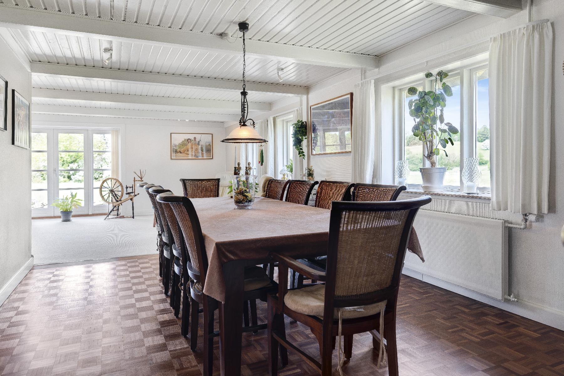 Selve stuehuset er på 311 kvadratmeter fordelt på to etager. I stueplan er der entré, bryggers med trappe til 1. sal. Badeværelse, et stort dejligt køkken, vinkelstue med direkte udgang til solterrasse. Alt sammen med en fantastisk udsigt til eng, skov og bakkerne i baghaven. Herudover er der 2 store værelser.