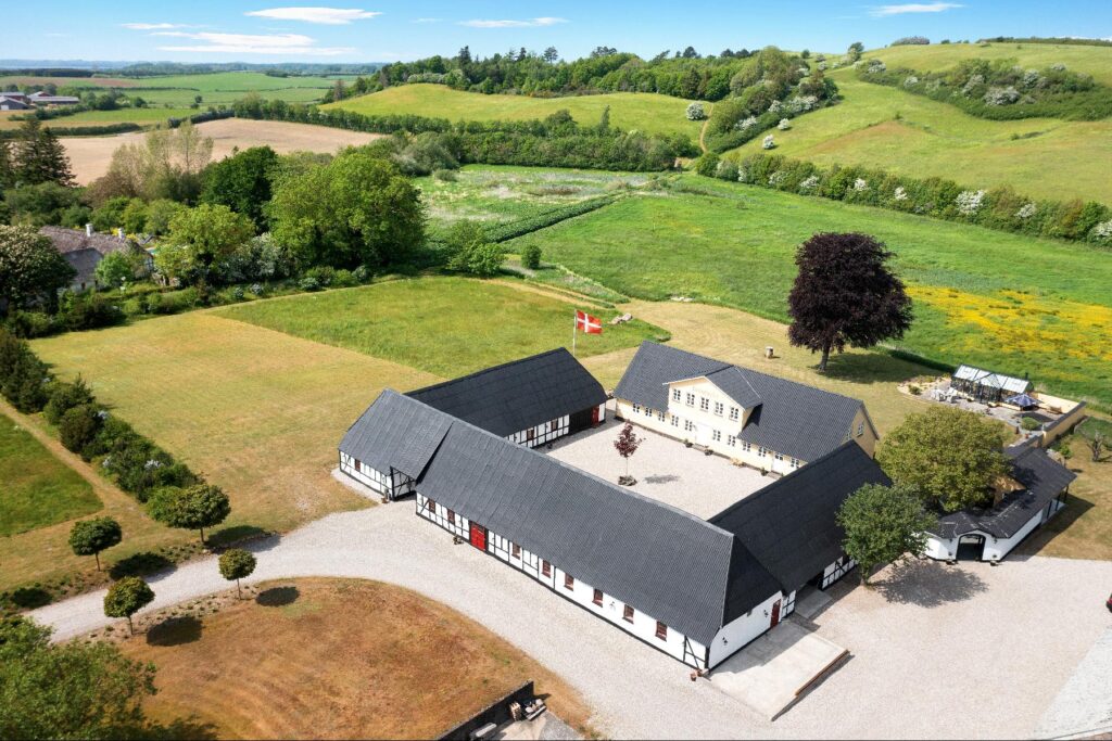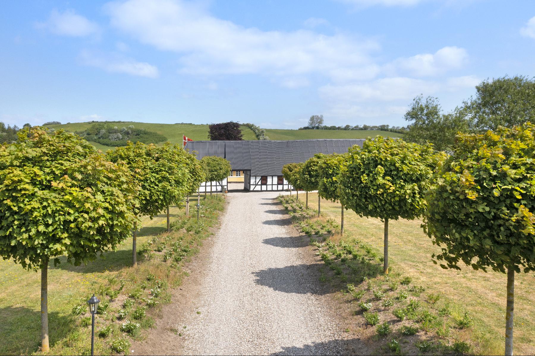 Ad smuk anlagt allé kommer du til denne fantastiske firelængede ejendom, hvor de tre gennemrenoverede staldlænger i bindingsværk rummer et utal af muligheder. Men det helt enestående ved denne ejendom er dens beliggenhed midt i naturen.