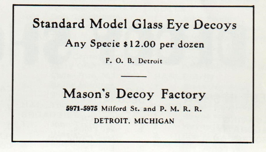 Udover de populære gråænder, canvasback’s og bjergænder fremstillede Mason lokkeduer, krager, vadefugle, gæs og svaner i tusindvis, indtil fabrikken lukkede i 1924.